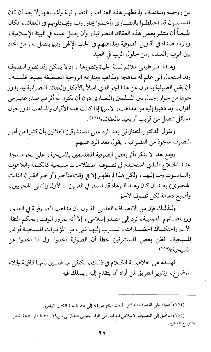 ويقول الدكتور التفتازاني بعد الرد على المستشرقين القائلين بأن كثيرا من أمور التصوف مأخوذة من النصرانية , يقول بعد الرد عليهم: