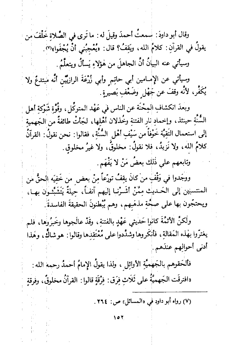 وقال أبو داودَ: سمعتُ أحمدَ وقيلَ له: ما تَرى في الصَّلاةِ خَلْفَ من يقولُ في القرآنِ: كلامُ الله، ويَقِفُ؟ قال: "يُعْجِبُني أنْ يُجْفَوا" (¬7).