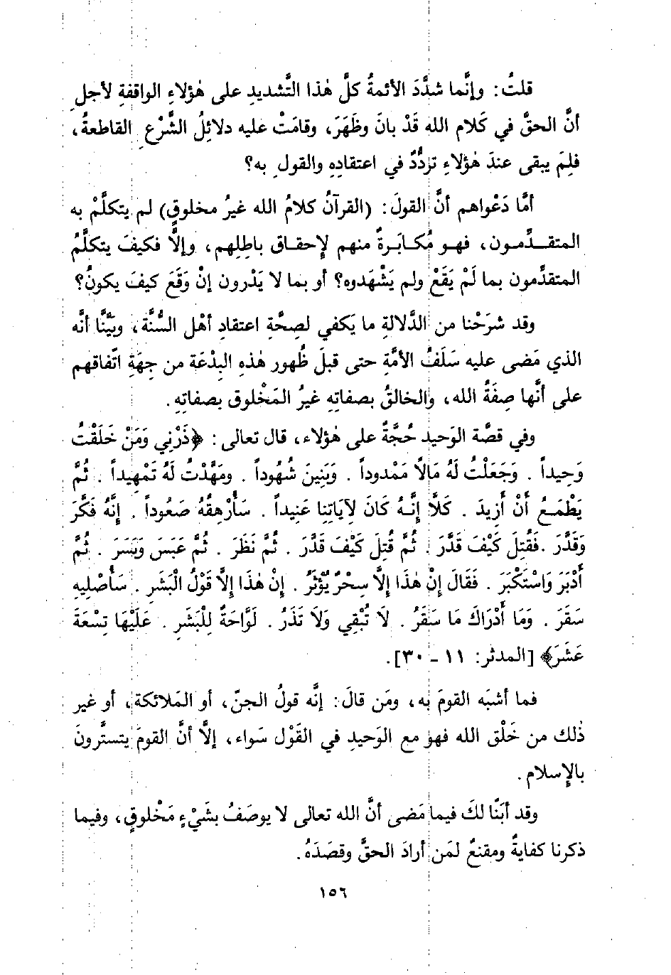 وقد شرَحْنا من الدَّلالةِ ما يَكفي لصِحَّةِ اعتقادِ أهْل السُّنَّة، وبَيَّنَّا أنَّه الذي مَضى عليه سَلَفُ الأمَّةِ حتى قبلَ ظُهور هذهِ البِدْعَة من جِهَةِ اتّفاقهم على أنَّها صِفَةُ الله، والخالقُ بصفاتِهِ غيرُ المَخْلوق بصفاتِهِ.