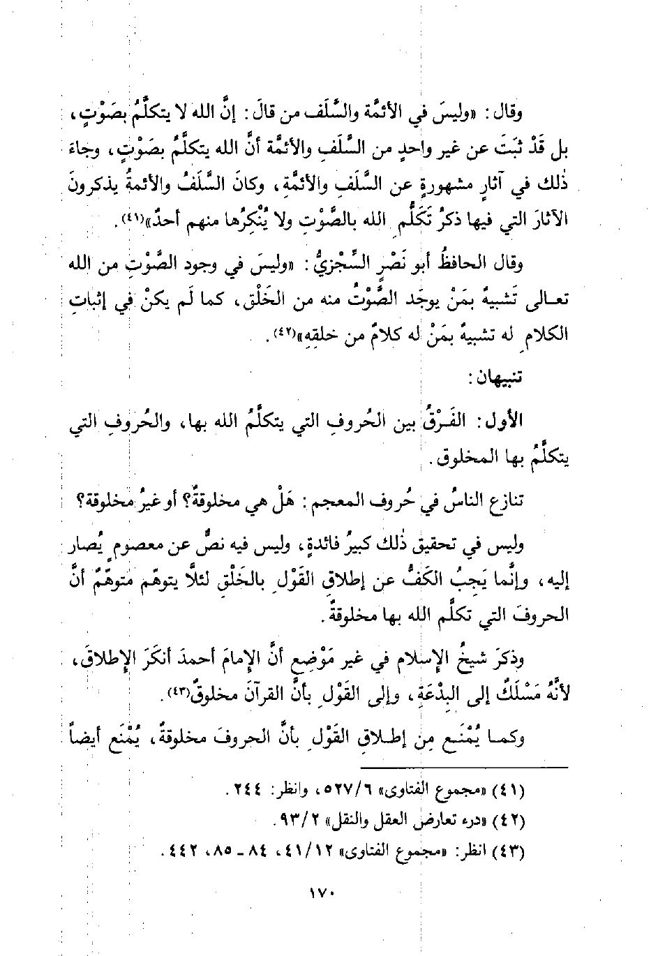 وليس في تحقيق ذلك كبيرُ فائدةٍ، وليس فيه نصٌّ عن معصومٍ يُصار إليه، وإنَّما يَجِبُ الكَفُّ عن إطلاقِ القَوْلِ بالخَلْقِ لئلاَّ يتوهّم متوهّمٌ أنَّ الحروفَ التي تكلَّم الله بها مخلوقةٌ.