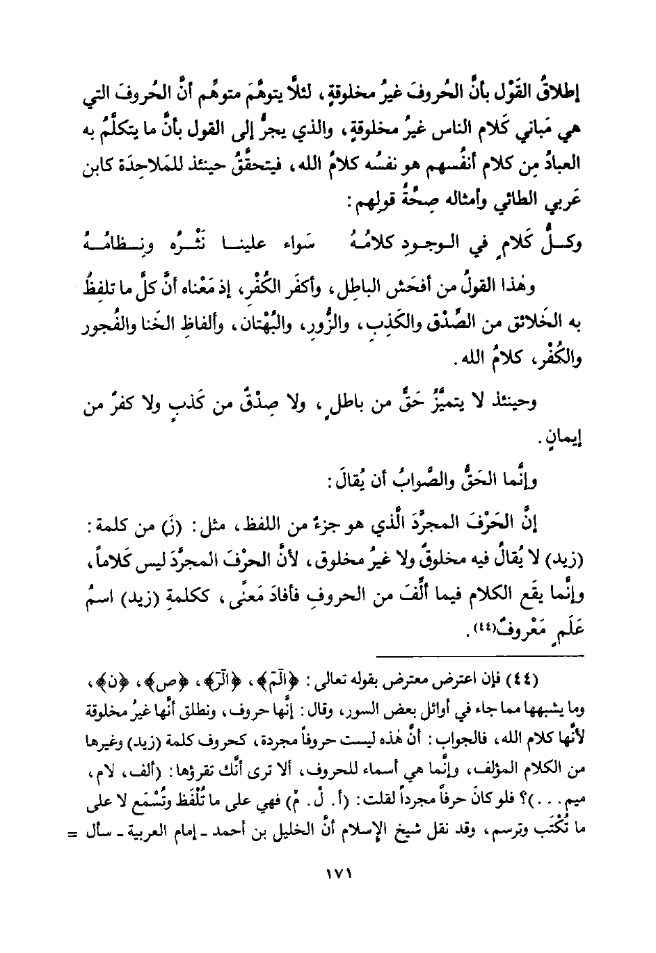 (¬44) فإن اعترض معترض بقوله تعالى: (الم)، (الر)، (ص) , (ن)، وما يشبهها مما جاء في أوائل بعض السور، وقال: إنَّها حروف، ونطلق أنَّها غيرُ مخلوقة لأنَّها كلام الله، فالجواب: أنَّ هذه ليست حروفاً مجردة، كحروف كلمة (زيد) وغيرها من الكلام المؤلف، وإنَّما هي أسماء للحروف، ألا ترى أنَّك تقرؤها: (ألف، لام، ميم ...)؟ فلو كان حرفاً مجرداً لقلت: (أ. لْ. مْ) فهي على ما تُلْفَظ وتُسْمَع لا على ما تُكْتب وترسم، وقد نقل شيخ الإِسلام أنَّ الخليل بن أحمد -إمام العربية- سأل =