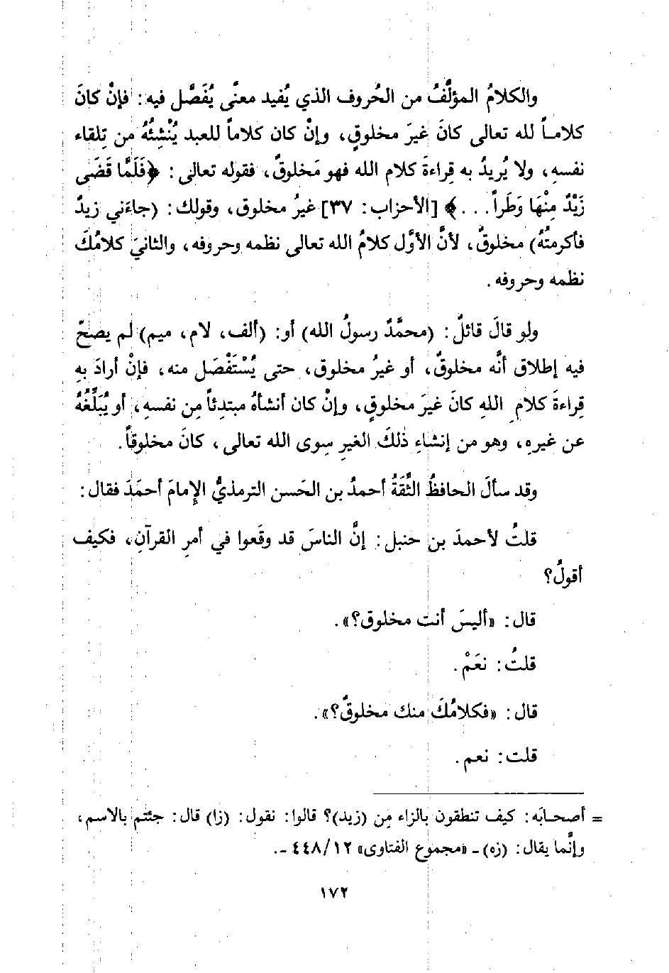 ولو قالَ قائلٌ: (محمَّدٌ رسولُ الله) أو: (ألف، لام، ميم) لم يصحّ فيه إطلاق أنَّه مخلوقٌ، أو غيرُ مخلوق، حتى يُسْتَفْصَل منه، فإنْ أرادَ بهِ قِراءةَ كلامِ اللهِ كانَ غيرَ مخلوقٍ، وإنْ كان أنشأهُ مبتدِئاً مِن نفسهِ، أو يُبَلِّغُهُ عن غيرهِ، وهو من إنشاءِ ذلكَ الغيرِ سِوى الله تعالى، كانَ مخلوقاً.