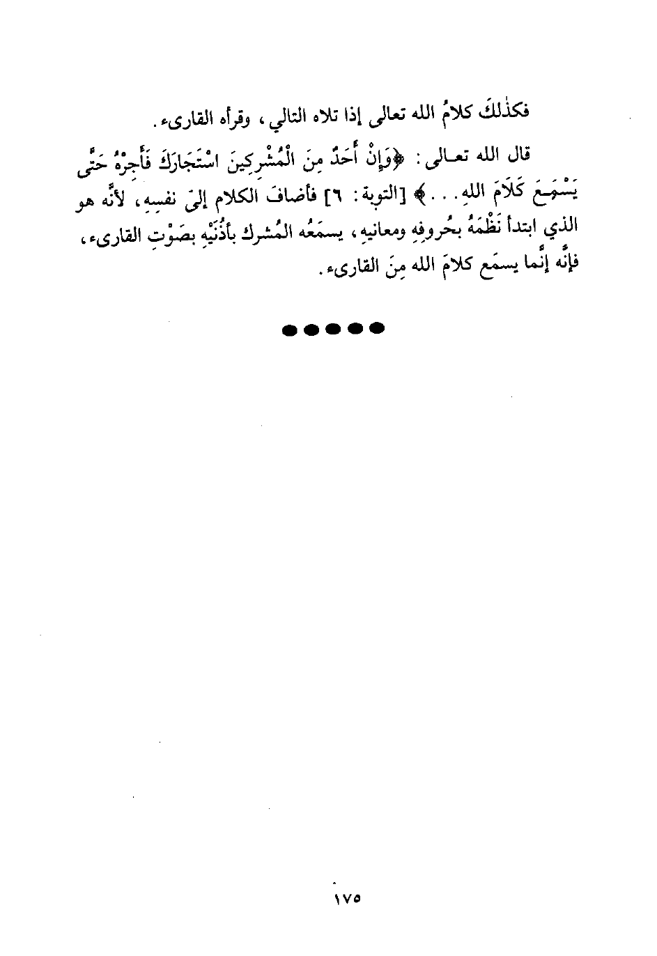 قال الله تعالى: {وَإِنْ أَحَدٌ مِنَ الْمُشْرِكِينَ اسْتَجَارَكَ فَأَجِرْهُ حَتَّى يَسْمَعَ كَلَامَ اللَّهِ ...} [التوبة: 6] فأضافَ الكلام إلى نفسِهِ، لأنَّه هو الذي ابتدأ نَظْمَهُ بحُروفِهِ ومعانيهِ، يسمَعُه المُشرك بأذُنَيْهِ بصَوْتِ القارئ، فإنَّه إنَّما يسمَع كلامَ الله مِنَ القارئ.