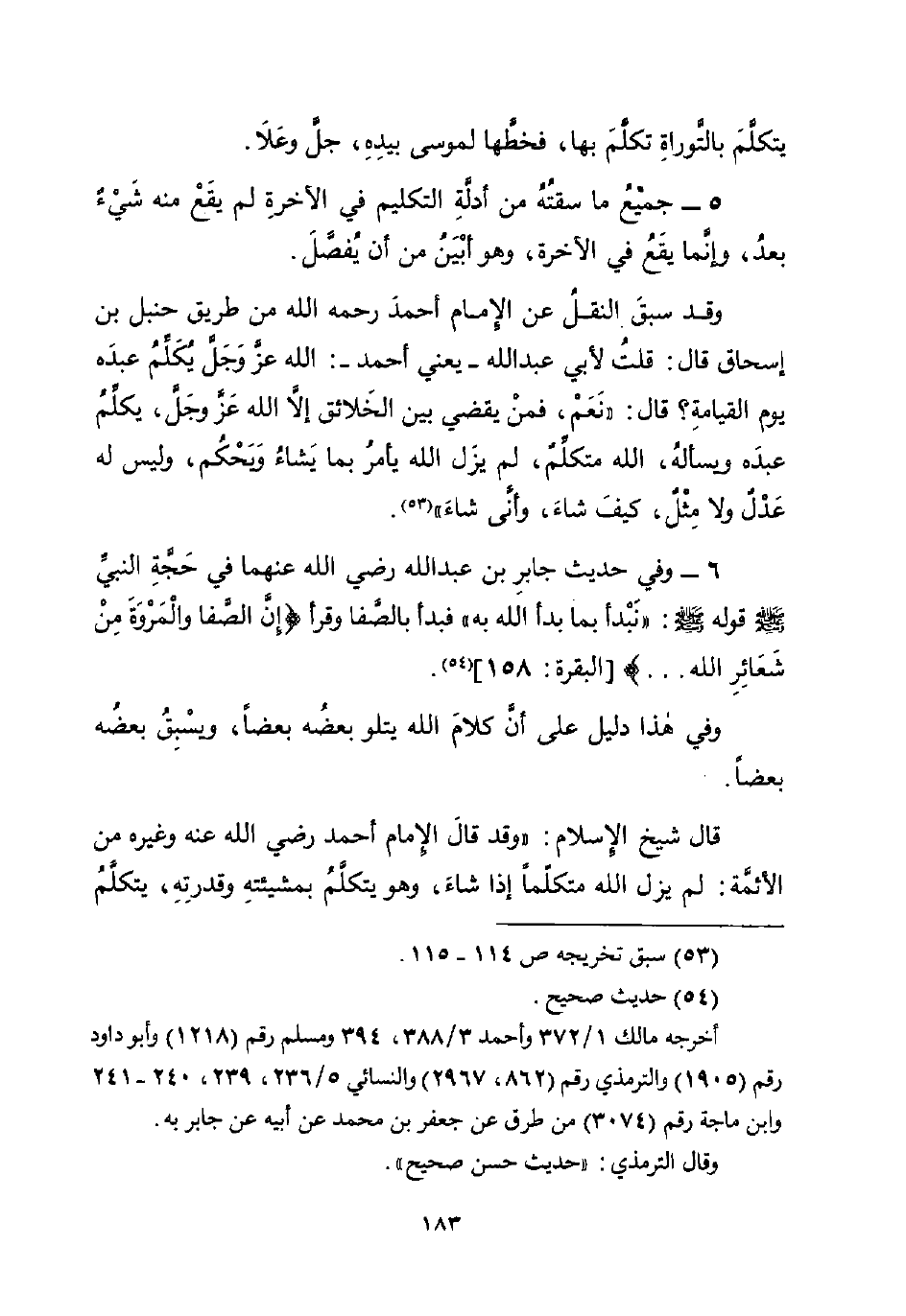 وقد سبقَ النقلُ عن الإِمام أحمدَ رحمه الله من طريق حنبل بن إسحاق قال: قلتُ لأبي عبد الله -يعني أحمد-: الله عزَّ وَجَلَّ يُكَلِّمُ عبدَه يوم القيامةِ؟ قال: "نَعَمْ، فمنْ يقضي بين الخَلائق إلاَّ الله عَزَّ وجَلَّ، يكلِّمُ عبدَه ويسألهُ، الله متكلِّمٌ، لم يزَل الله يأمرُ بما يَشاءُ وَيَحْكُم، وليس له عَدْلٌ ولا مِثْلٌ، كيفَ شاءَ، وأنَّى شاءَ" (¬53).