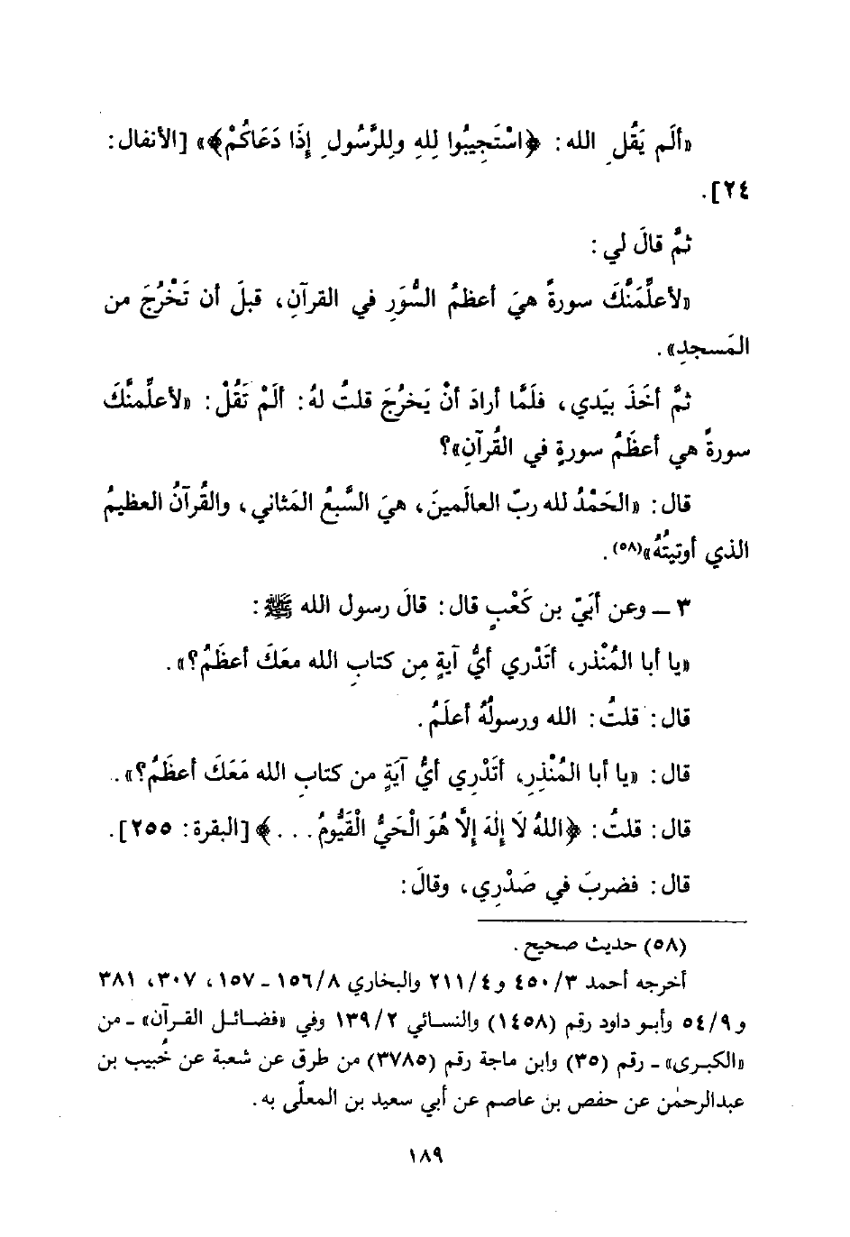 ثمَّ أخَذَ بيَدي، فلَمَّا أرادَ أنْ يَخرُجَ قلتُ لهُ: ألَمْ تَقُلْ: "لأعلِّمنَّكَ سورةً هي أعظَمُ سورةٍ في القُرآنِ"؟