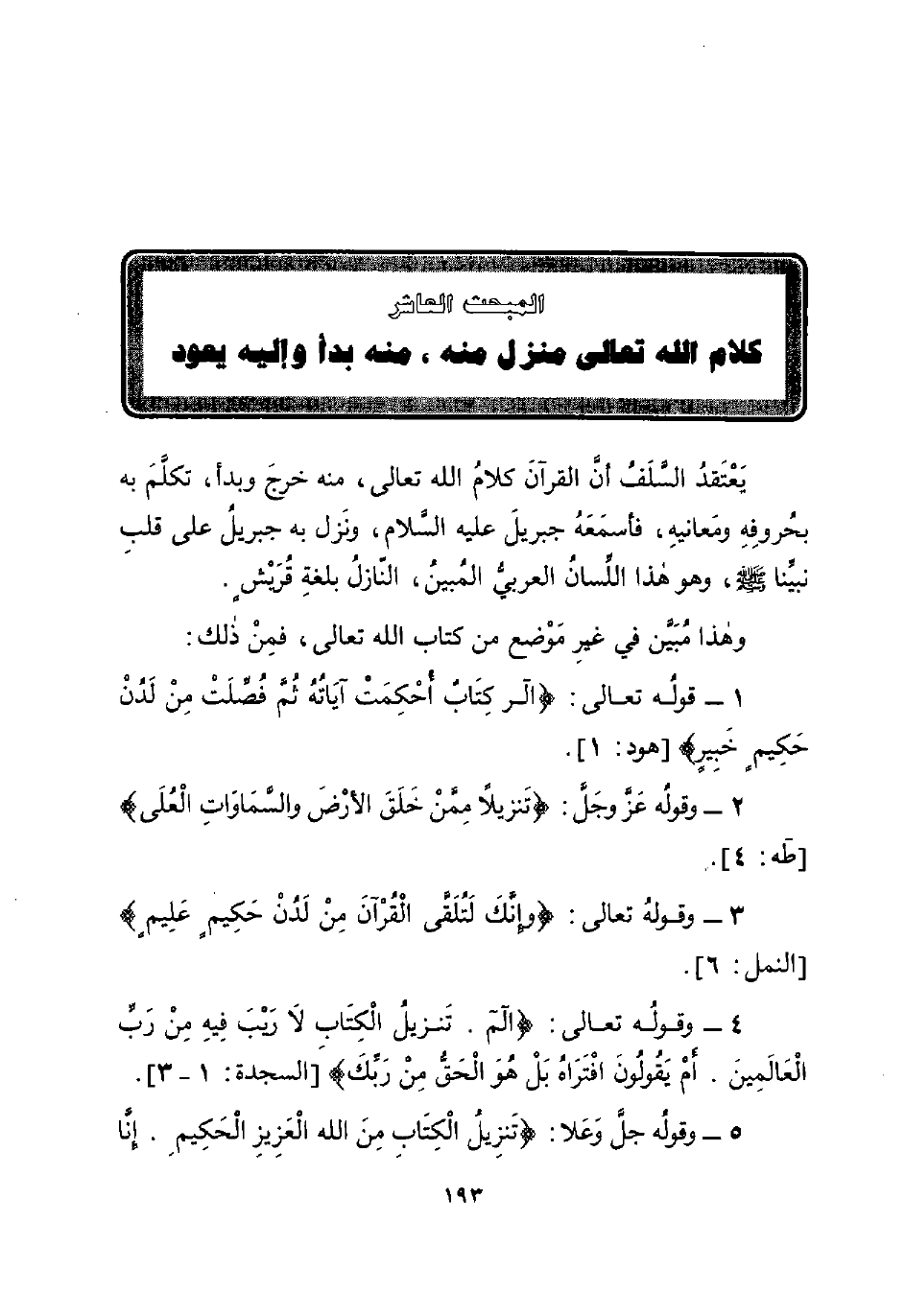 المبحث العاشر: كلام الله تعالى منزل منه , منه بدأ وإليه يعود