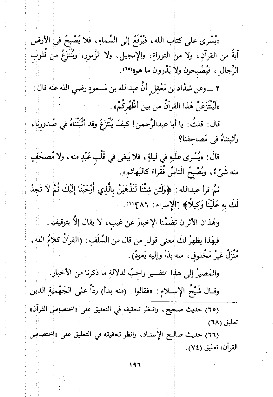 ثمَّ قرأ عبد الله: {وَلَئِنْ شِئْنَا لَنَذْهَبَنَّ بِالَّذِي أَوْحَيْنَا إِلَيْكَ ثُمَّ لَا تَجِدُ لَكَ بِهِ عَلَيْنَا وَكِيلًا} [الإسراء: 86] (¬66).