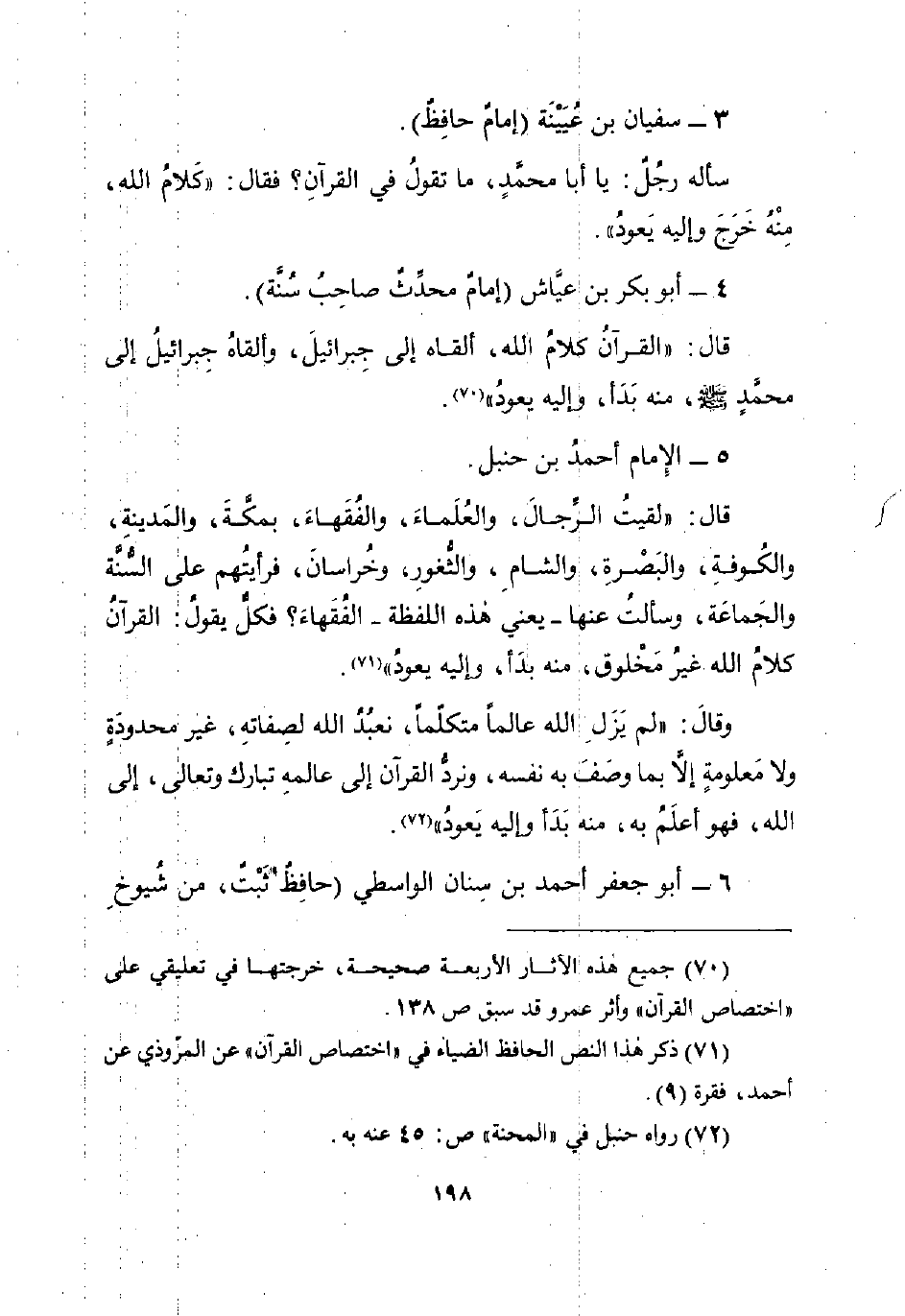 وقالَ: "لم يَزَلِ الله عالماً متكلّماً، نعبُدُ الله لصِفاتهِ، غير محدودَةٍ ولا مَعلومةٍ إلَّا بما وصَفَ به نفسه، ونردُّ القرآن إلى عالمهِ تبارك وتعالى، إلى الله، فهو أعلَمُ به، منه بَدَأ وإليه يَعودُ" (¬72).