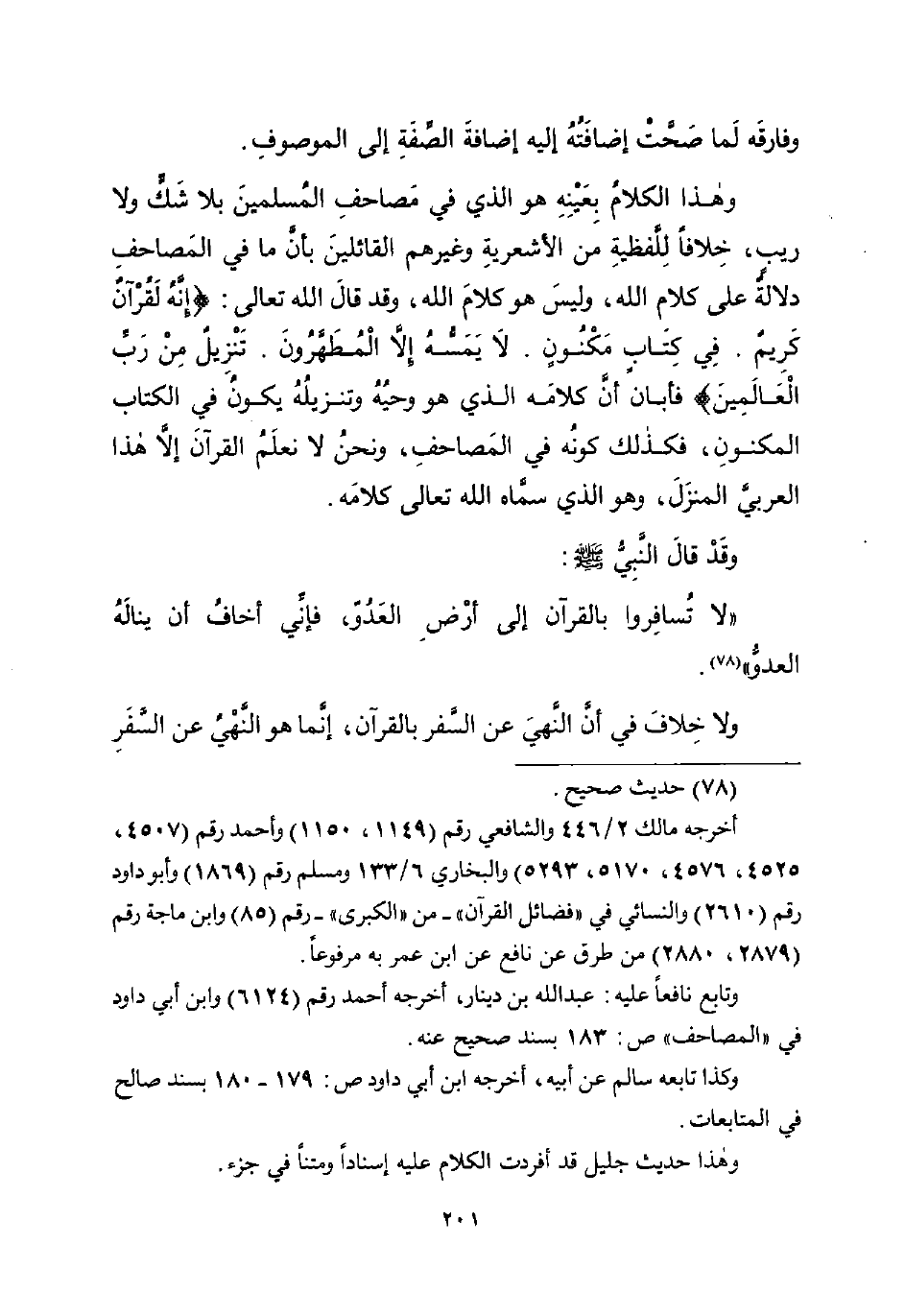 وهذا الكلامُ بعَيْنِهِ هو الذي في مَصاحفِ المُسلمينَ بلا شَكٍّ ولا ريبٍ، خِلافاً لِلَّفظيةِ من الأشعريةِ وغيرهم القائلينَ بأنَّ ما في المَصاحفِ دلالةٌ على كلام الله، وليسَ هو كلامَ الله، وقد قالَ الله تعالى: {إِنَّهُ لَقُرْآنٌ كَرِيمٌ (77) فِي كِتَابٍ مَكْنُونٍ (78) لَا يَمَسُّهُ إِلَّا الْمُطَهَّرُونَ (79) تَنْزِيلٌ مِنْ رَبِّ الْعَالَمِينَ} فأبان أنَّ كلامَه الذي هو وحيُهُ وتنزيلُهُ يكونُ في الكتاب المكنونِ، فكذلك كونُه في المَصاحفِ، ونحنُ لا نعلَمُ القرآنَ إلاَّ هذا العربيَّ المنزَلَ، وهو الذي سمَّاه الله تعالى كلامَه.