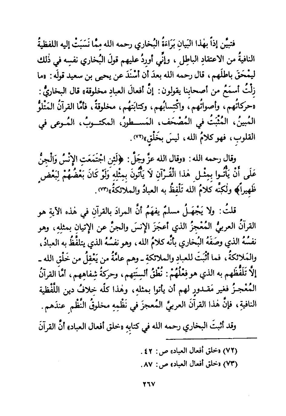 وقد أثبتَ البخاري رحمه الله في كتابِهِ "خلق أفعال العباد" أنَّ القرآنَ
