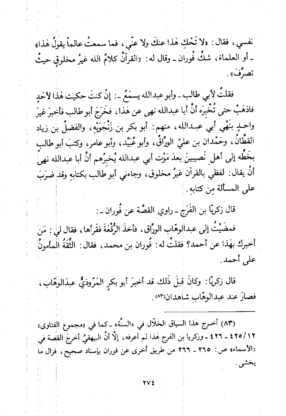 (¬83) أخرج هذا السياق الخلّال في "السنَّة" -كما في "مجموع الفتاوى" 12/ 425 - 426 - وزكريا بن الفرج هذا لم أعرفه، إلَّا أنَّ البيهقيَّ أخرجَ القصة في "الأسماء" ص: 265 - 266 من طريق أخرى عن فوران بإسناد صحيح، فزال ما يخشى.