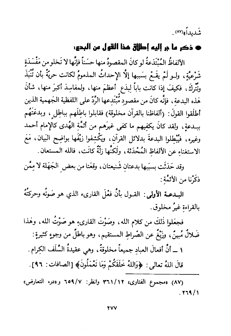 البدعة الأولى: القول بأنَّ فعْلَ القارئ الذي هو صَوتُه وحركتُهُ بالقراءةِ غيرُ مخلوق.