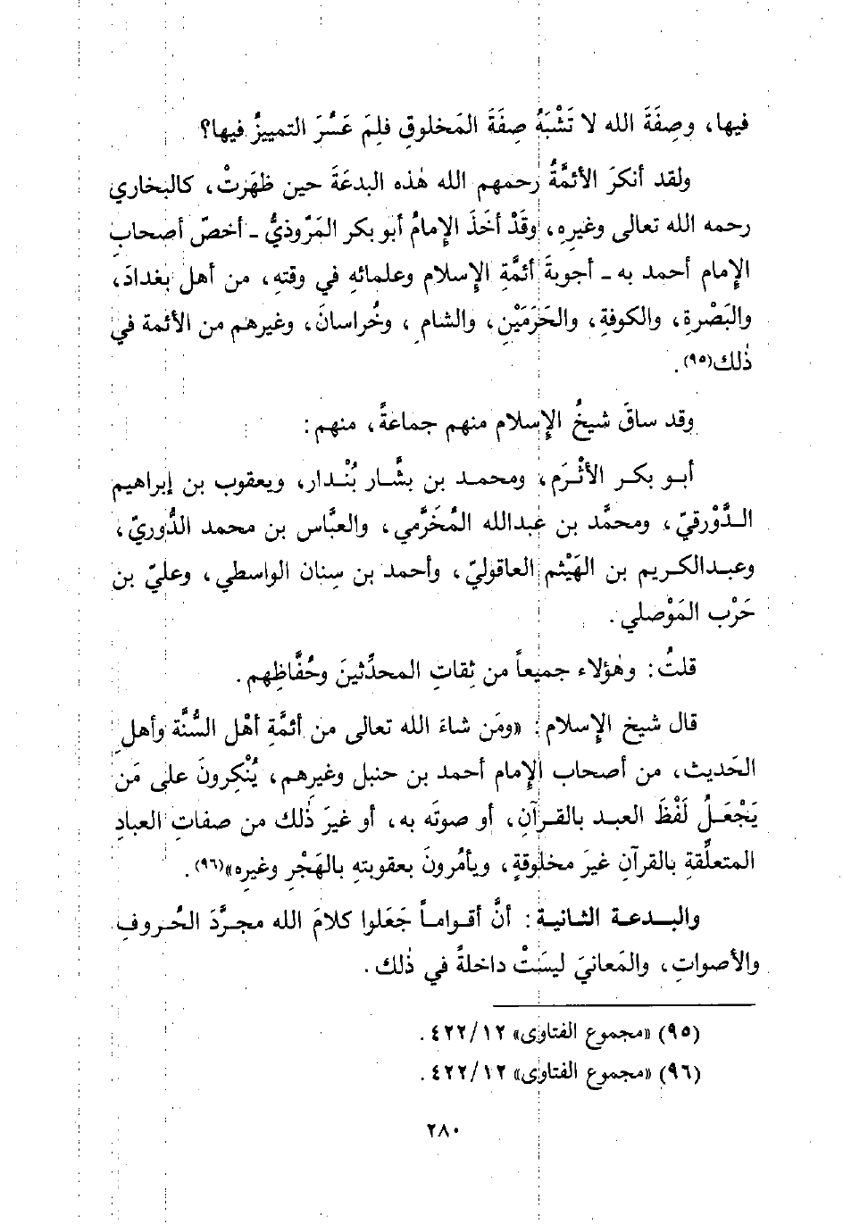 قال شيخ الإِسلام: "ومَن شاءَ الله تعالى من أئمَّةِ أهْل السُّنَّة وأهلِ الحَديث، من أصحاب الإِمام أحمد بن حنبل وغيرِهم، يُنْكِرونَ على مَن يَجْعَلُ لَفْظَ العبد بالقرآنِ، أو صوتَه به، أو غيرَ ذلك من صفاتِ العبادِ المتعلِّقةِ بالقرآنِ غيرَ مخلوقةٍ، ويأمُرونَ بعقوبتهِ بالهَجْرِ وغيرِه" (¬96).