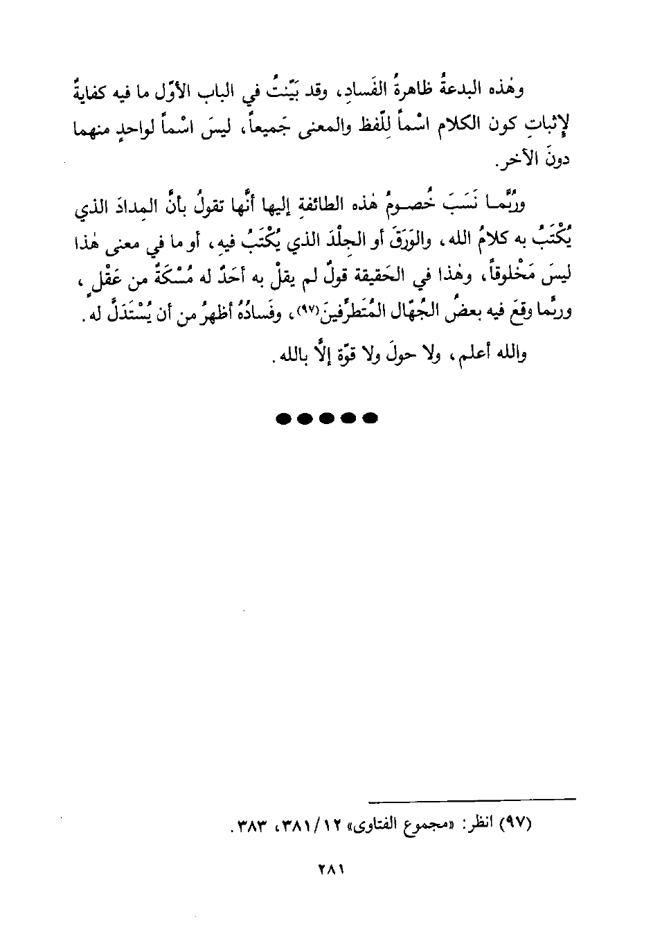 وهذه البدعةُ ظاهرةُ الفَسادِ، وقد بَيّنتُ في الباب الأوّل ما فيه كفايةٌ لإِثباتِ كون الكلام اسْمًا لِلّفظ والمعنى جَميعًا، ليسَ اسْمًا لواحدٍ منهما دونَ الآخر. ورُبَّما نسَبَ خُصومُ هذه الطائفةِ إليها أنَّها تقولُ بأنَّ المِدادَ الذي يُكْتَبُ به كلامُ الله، والوَرَقَ أو الجِلْدَ الذي يُكْتَبُ فيهِ، أو ما في معنى هذا ليسَ مَخْلوقًا، وهذا في الحَقيقة قولٌ لم يقلْ به أحدٌ له مُسْكَةٌ من عَقْلٍ، وربَّما وقعَ فيه بعضُ الجُهُال المُتَطرَّفينَ (¬97)، وفَسادُهُ أظهرُ من أن يُسْتَدَلَّ له. والله أعلم، ولا حولَ ولا قوّة إلاَّ بالله.