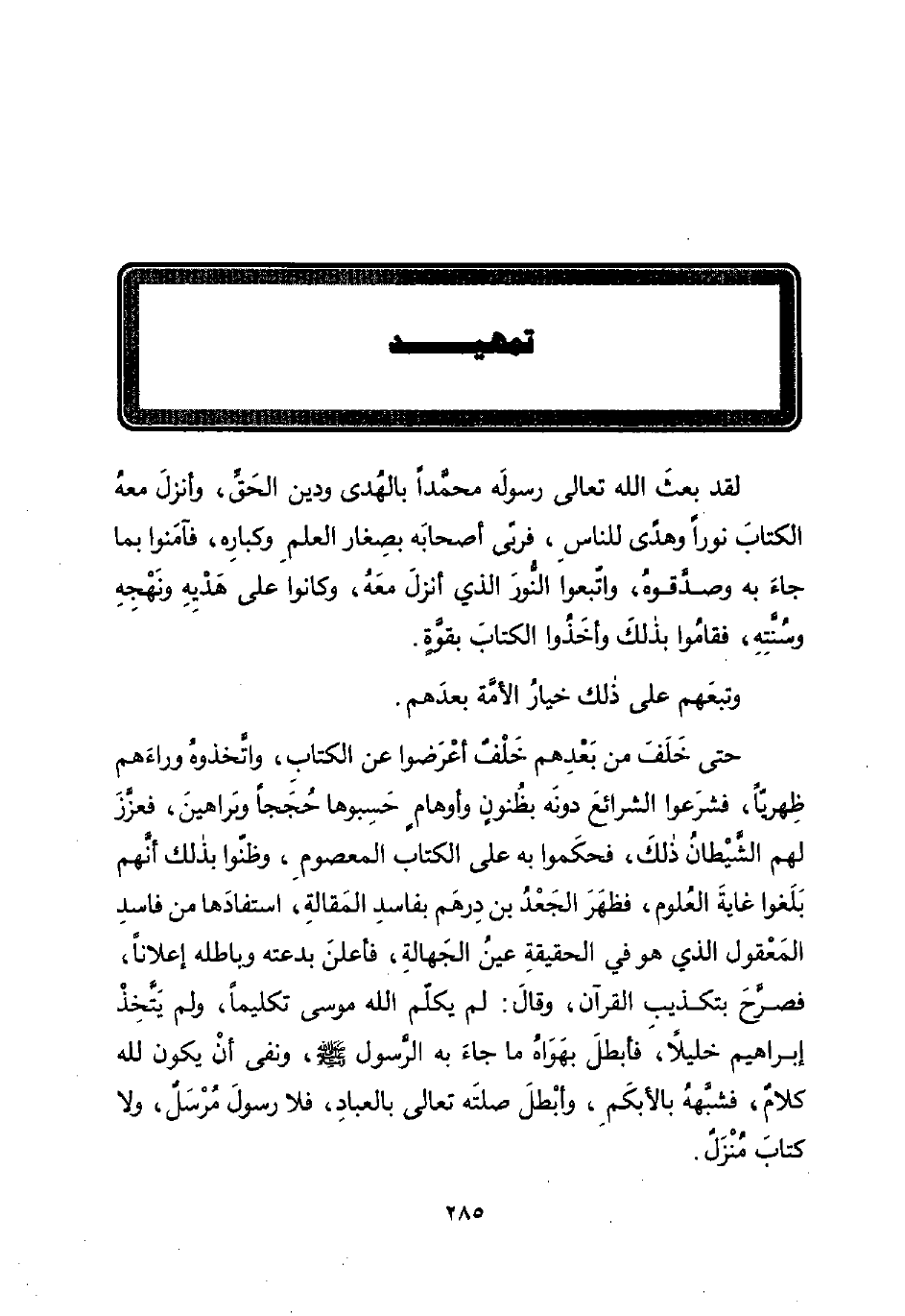 حتى خَلَفَ من بَعْدِهم خَلْفٌ أعْرَضوا عن الكتابِ، واتَّخذوهُ وراءَهم ظِهريًا، فشرَعوا الشرائعَ دونَه بظُنونٍ وأوهامٍ حَسِبوها حُجَجًا وبَراهينَ، فعزَّزَ لهم الشَّيْطانُ ذلكَ، فحكَموا به على الكتاب المعصومِ، وظنّوا بذلك أنَّهم بَلَغوا غايةَ العُلوم، فظهَرَ الجَعْدُ بن دِرهَم بفاسدِ المَقالةِ، استفادَها من فاسدِ المَعْقول الذي هو في الحقيقةِ عينُ الجَهالةِ، فأعلنَ بدعته وباطله إعلانًا، فصرَّح بتكذيب القرآن، وقالَ: لم يكلّم الله موسى تكليمًا، ولم يتَّخِذْ إبراهيم خليلًا، فأبطلَ بهَواهُ ما جاءَ به الرَّسول -صلى الله عليه وسلم-، ونفى أنْ يكون لله
