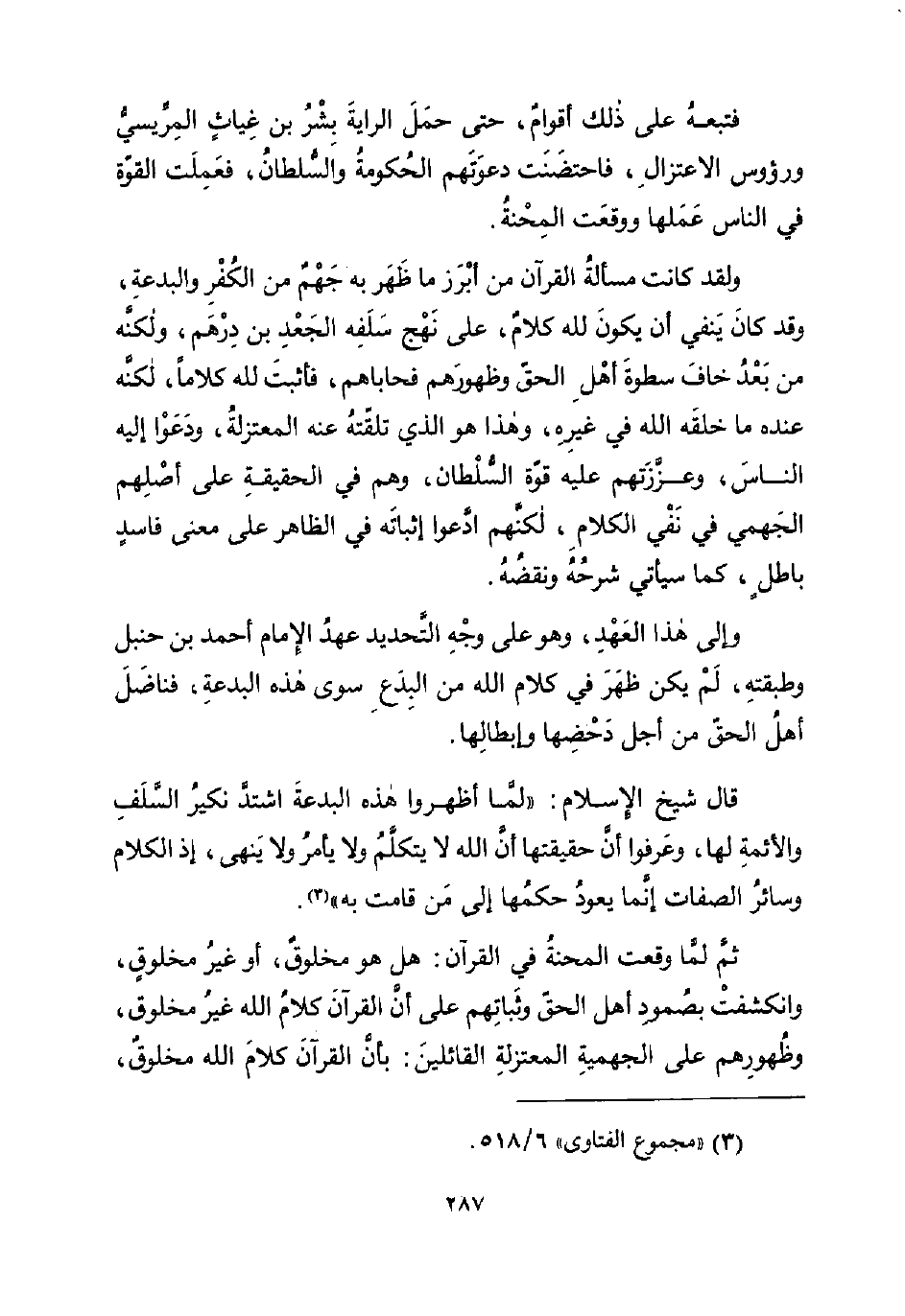 ثمَّ لمَّا وقعت المحنةُ في القرآن: هل هو مخلوقٌ، أو غيرُ مخلوقٍ، وانكشفتْ بصُمودِ أهل الحقّ وثَباتِهم على أنَّ القرآنَ كلامُ الله غيرُ مخلوق، وظُهورِهم على الجهميةِ المعتزلةِ القائلينَ: بأنَّ القرآنَ كلامَ الله مخلوقٌ،