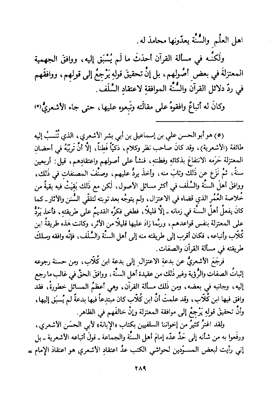 (¬5) هو أبو الحسن علي بن إسماعيل بن أبي بشر الأشعري، الذي تُنْسبُ إليه طائفة (الأشعرية)، وقد كانَ صاحب نظر وكلام، ذكيّاً فَطِناً، إلَّا أنَّ تَربّيَهُ في أحضانِ المعتزلة حَرَمه الانتفاعَ بذكائهِ وفطنتهِ، فنشأ على أصولهم واعتقادِهم، قيل: أربعين سنةً، ثمَّ نَزَع عن ذلك وتابَ منه، وأخذَ يردُّ عليهم، وصنَّفَ المصنفاتِ في ذلك، ووافقَ أهلَ السنَّة والسَّلَف في أكثر مسائل الأصول، لكن مع ذلك بَقِيَتْ فيه بقيةٌ من خُلاصة العُمُر الذي قضاه في الاعتزال، ولم يتوجَّه بعد توبته لتلقّي السُّنن والآثار -كما كانَ يفعلُ أهلُ السنَّة في زمانه- إلاَّ قليلًا، فطغى فكرُه القديمُ على طريقتهِ، فأخذ يَرُدُّ على المعتزلة بنفس قواعدهم، وربَّما زادَ عليها قليلًا من الأثر، وكانت هذه طريقةُ ابن كُلّاب وأتباعه، فكان أقرب إلى طريقته منه إلى أهل السنَّة والسَّلَف، فإنَّه وافقه وسلكَ طريقته في مسألة القرآن والصفات.