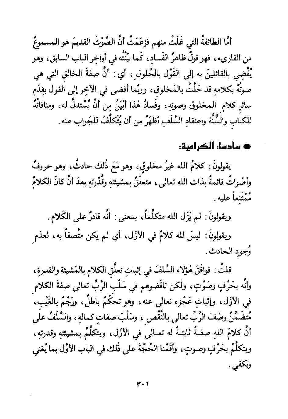 قلتُ: فوافَقَ هؤلاء السَّلفَ في إثباتِ تعلُّقِ الكلام بالمَشيئة والقدرةِ، وأنَّه بحَرْفٍ وصَوْتٍ، ولكن ناقَضوهم في سَلْبِ الرَّبِّ تعالى صفةَ الكلامِ في الأزَل، وإثباتِ عَجْزهِ تعالى عنه، وهو تحكّمٌ باطلٌ، ورَجْمٌ بالغَيْبِ، مُتضَمِّنٌ وصْفَ الرَّبِّ تعالى بالنَّقْصِ، وسَلْبَ صفاتِ كمالهِ، والسَّلَفُ علَى أنَّ كلامَ اللهِ صفةٌ ثابتةٌ له تعالى في الأزَل، ويتكلَّمُ بمشيئتهِ وقدرتهِ، ويتكلَّمُ بحَرْفٍ وصوتٍ، وأقَمْنا الحُجَّةَ على ذلك في الباب الأوَّل بما يُغني ويَكفي.