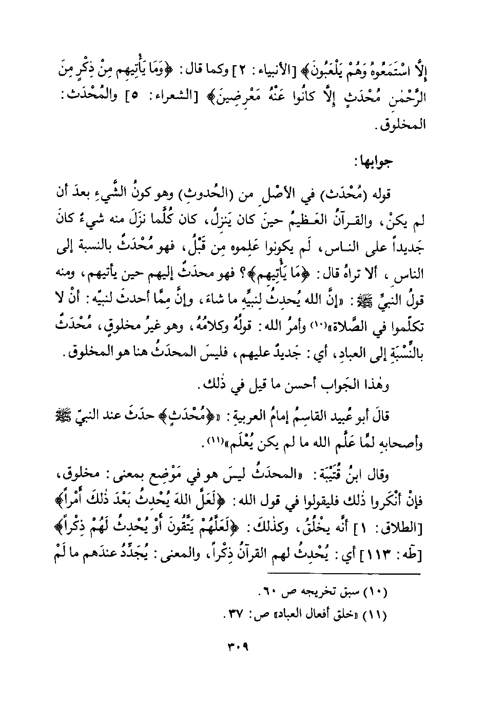 قوله (محْدَث) في الأصْلِ من (الحُدوثِ) وهو كونُ الشَّيءِ بعدَ أن لم يكنْ، والقرآن العَظيمُ حينَ كان يَنزِلُ، كان كُلَّما نزَلَ مه شيءٌ كانَ جَديداً على الناس، لَم يكونوا عَلِموه مِن قَبْلُ، فهو مُحْدَثٌ بالنسبة إلى الناسِ، ألا تراهُ قال: {مَا يَأْتِيهِمْ}؟ فهو محدَثٌ إليهم حين يأتيهم، ومنه قولُ النبيِّ -صلى الله عليه وسلم-: "إنَّ الله يُحدِثُ لِنبيِّه ما شاءَ، وإنَّ مِمَّا أحدثَ لنبيّه: أنْ لا تكلّموا في الصَّلاة" (¬10) وأمرُ الله: قولُهُ وكلامُهُ، وهو غيرُ مخلوقٍ، مُحْدَثٌ بالنسْبَةِ إلى العبادِ، أي: جديدٌ عليهم، فليسَ المحدَثُ هنا هو المخلوق.