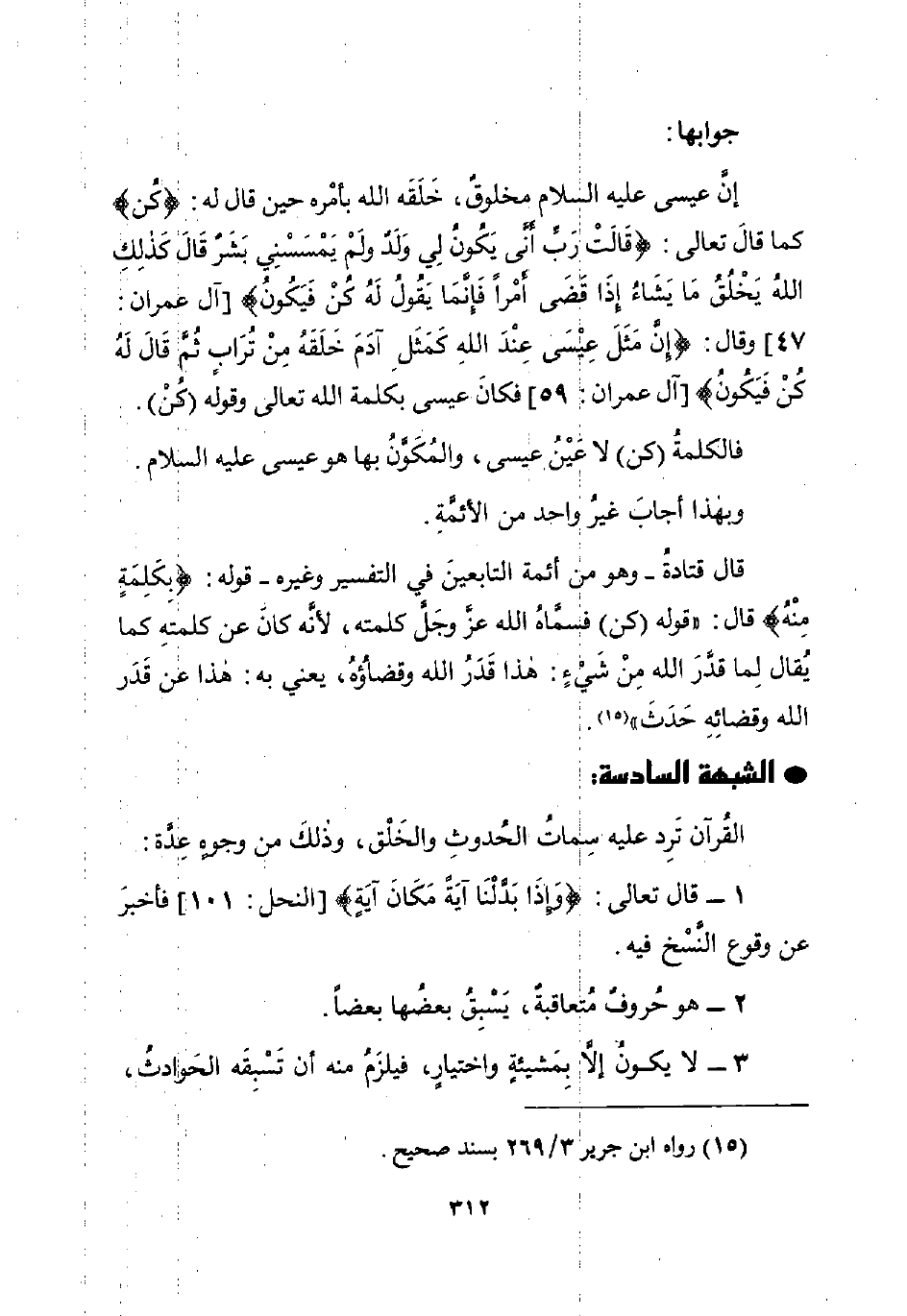 فالكلمةُ (كن) لا عَيْنُ عيسى، والمُكَوَّنُ بها هو عيسى عليه السلام. وبهذا أجابَ غيرُ واحد من الأئمَّةِ.