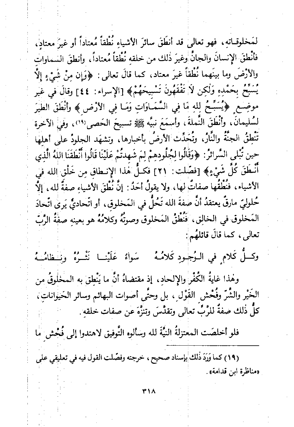 لمَخلوقاتهِ، فهو تعالى قد أنطَقَ سائرَ الأشياءِ نُطْقاً مُعتاداً أو غيرَ معتادٍ، فأنْطقَ الإِنسانَ والجانَّ وغيرَ ذلك من خلقهِ نُطْقاً مُعتاداً، وأنطقَ السماوات والأرْضَ وما بينَهما نُطْقاً غيرَ معتاد، كما قالَ تعالى: {وَإِنْ مِنْ شَيْءٍ إِلَّا يُسَبِّحُ بِحَمْدِهِ وَلَكِنْ لَا تَفْقَهُونَ تَسْبِيحَهُمْ} [الِإسراء: 44] وقالَ في غير موضِع {يُسَبِّحُ لِلَّهِ مَا فِي السَّمَاوَاتِ وَمَا فِي الْأَرْضِ} وأنْطَقَ الطيرَ لسُليمانَ، وأنْطَقَ النَّملةَ، وأسمَعَ نبيَّه -صلى الله عليه وسلم- تسبيحَ الحَصى (¬19)، وفي الآخرة تَنْطِقُ الجنَّةُ والنَّارُ، وتُحَدَّث الأرضُ بأخبارها، وتشهَد الجلودُ على أهلِها حين تُبْلى السَّرائرُ: {وَقَالُوا لِجُلُودِهِمْ لِمَ شَهِدْتُمْ عَلَيْنَا قَالُوا أَنْطَقَنَا اللَّهُ الَّذِي أَنْطَقَ كُلَّ شَيْءٍ} [فصْلت: 21] فكلُّ هذا الِإنطاقِ مِن خَلْقِ الله في الأشياء، فنُطْقُها صفاتٌ لها, ولا يقولُ أحَدٌ: إنَّ نُطْق الأشياءِ صفَةٌ لله، إلاَّ حُلوليّ مارقٌ يعتقدُ أنَّ صفةَ الله تَحُلُّ في المَخلوقِ، أو اتّحاديٌّ يَرى اتّحادَ المَخلوق في الخالِق، فَنُطْقُ المَخلوق وصوتُهُ وكلامُهُ هو بعينهِ صفةُ الرَّبّ تعالى، كما قالَ قائلهُم: