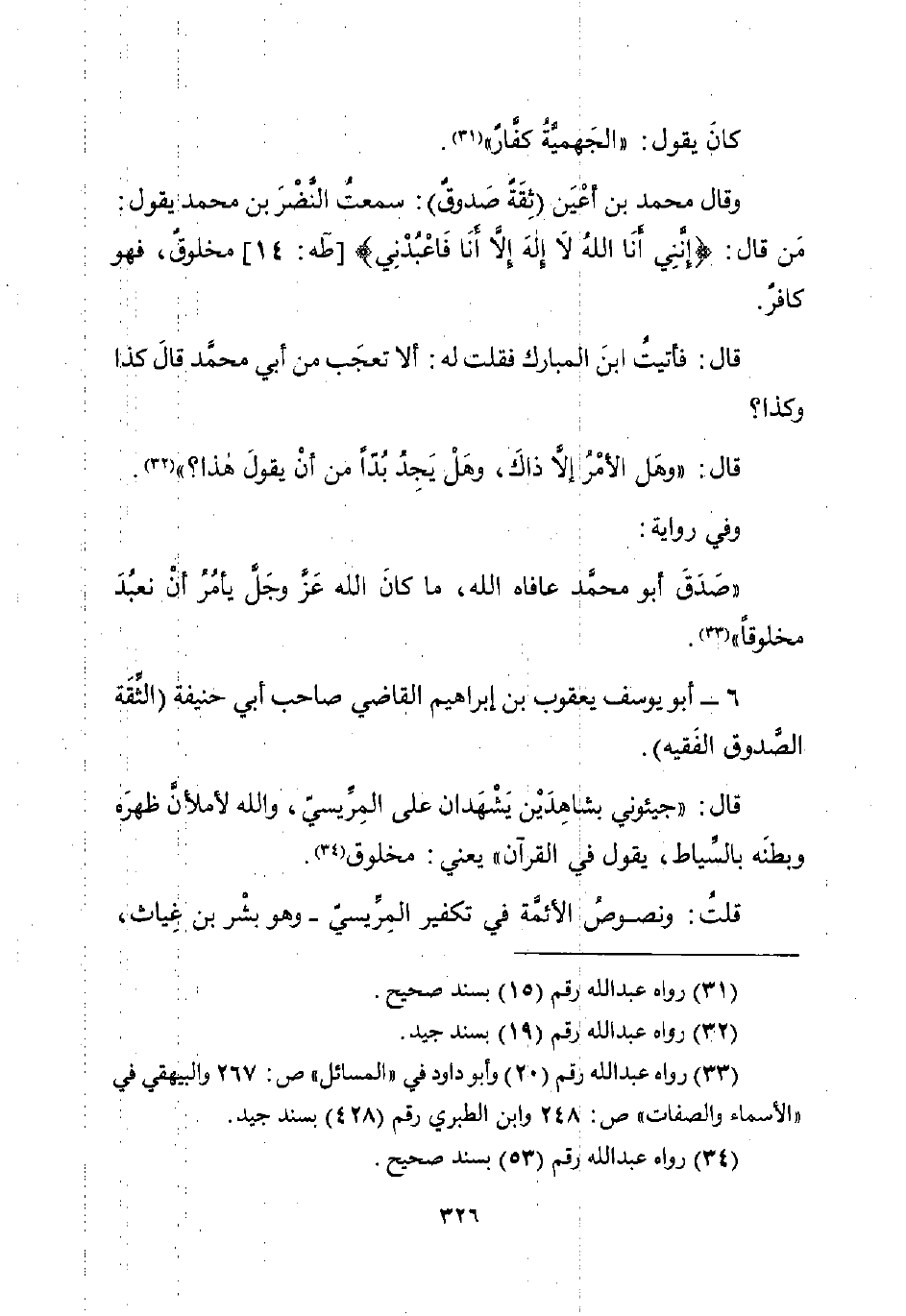 وقال محمد بن أعْيَن (ثِقَةٌ صَدوقٌ): سمعتُ النَّضْرَ بن محمد يقول: مَن قال: {إِنَّنِي أَنَا اللَّهُ لَا إِلَهَ إِلَّا أَنَا فَاعْبُدْنِي} [طه: 14]، مخلوقٌ، فهوكافرٌ.
