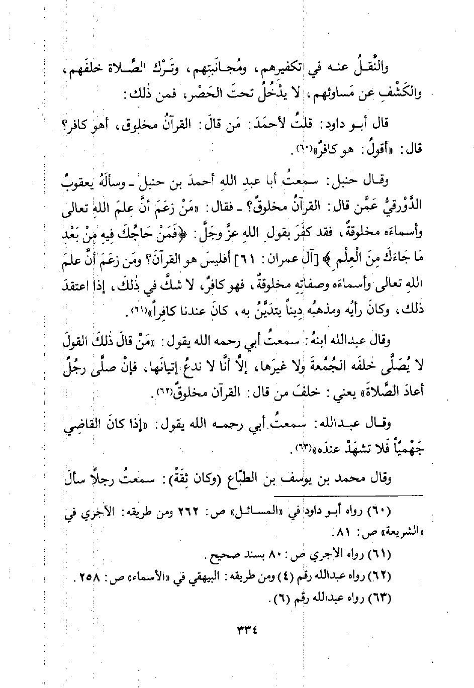 وقال حنبل: سمعتُ أبا عبدِ اللهِ أحمدَ بن حنبل -وسألَهُ يعقوبُ الدَّوْرقيُّ عَمَّن قال: القرآنُ مخلوقٌ؟ - فقال: "مَنْ زعَمَ أنَّ عِلمَ اللهِ تعالى وأسماءَه مخلوقةٌ، فقد كفَرَ بقولِ اللهِ عزَّ وجَلَّ: {فَمَنْ حَاجَّكَ فِيهِ مِنْ بَعْدِ مَا جَاءَكَ مِنَ الْعِلْمِ} [آل عمران: 61] أفليسَ هو القرآنَ؟ ومَن زعَمَ أنَّ علمَ اللهِ تعالى وأسماءَه وصفاتِهِ مخلوقةٌ، فهو كافرٌ، لا شكَّ في ذلكَ، إذا اعتقدَ ذلك، وكانَ رأيُه ومذهبُه دِيناً يتدَيَّنُ به، كانَ عندنا كافِرًا" (¬61).