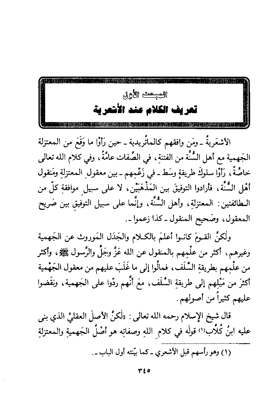 قال شيخ الإِسلام رحمه الله تعالى: "لكنَّ الأصلَ العقليَّ الذي بني عليه ابنُ كُلَّاب (¬1) قولَه في كلامِ اللهِ وصفاتِه هو أصْلُ الجَهميةِ والمعتزلةِ