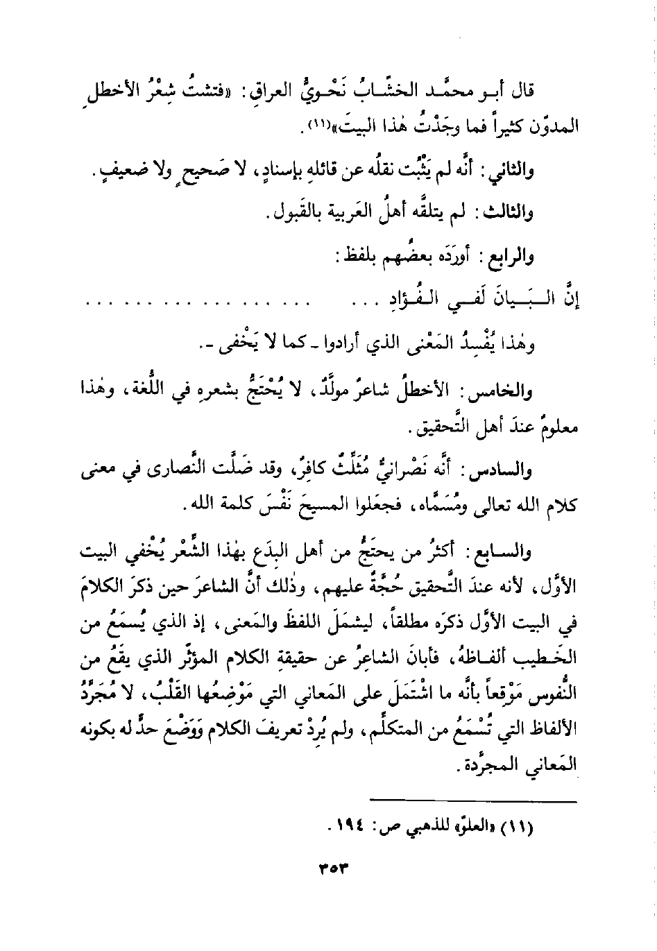 والخامس: الأخطلُ شاعرٌ مولَّدٌ، لا يُحْتَجُّ بشعرهِ في اللُّغة، وهذا معلومٌ عندَ أهل التَّحقيق.