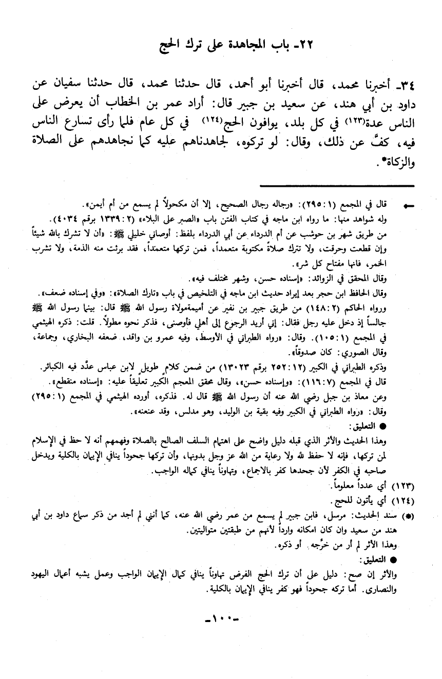 34 - حَدَّثَنَا سُفْيَانُ، عَنْ دَاوُدَ بْنِ أَبِي هِنْدٍ، عَنْ سَعِيدِ بْنِ جُبَيْرٍ، قَالَ: أَرَادَ عُمَرُ بْنُ الْخَطَّابِ أَنْ §يَعْرِضَ عَلَى النَّاسِ عِدَّةً فِي كُلِّ بَلَدٍ يُوَافُونَ الْحَجَّ فِي كُلِّ عَامٍ، فَلَمَّا رَأَى تَسَارُعَ النَّاسِ فِيهِ، كَفَّ عَنْ ذَلِكَ، وقَالَ: «لَوْ تَرَكُوهُ، لَجَاهَدْنَاهُمْ عَلَيْهِ كَمَا نُجَاهِدُهُمْ عَلَى الصَّلَاةِ وَالزَّكَاةِ»