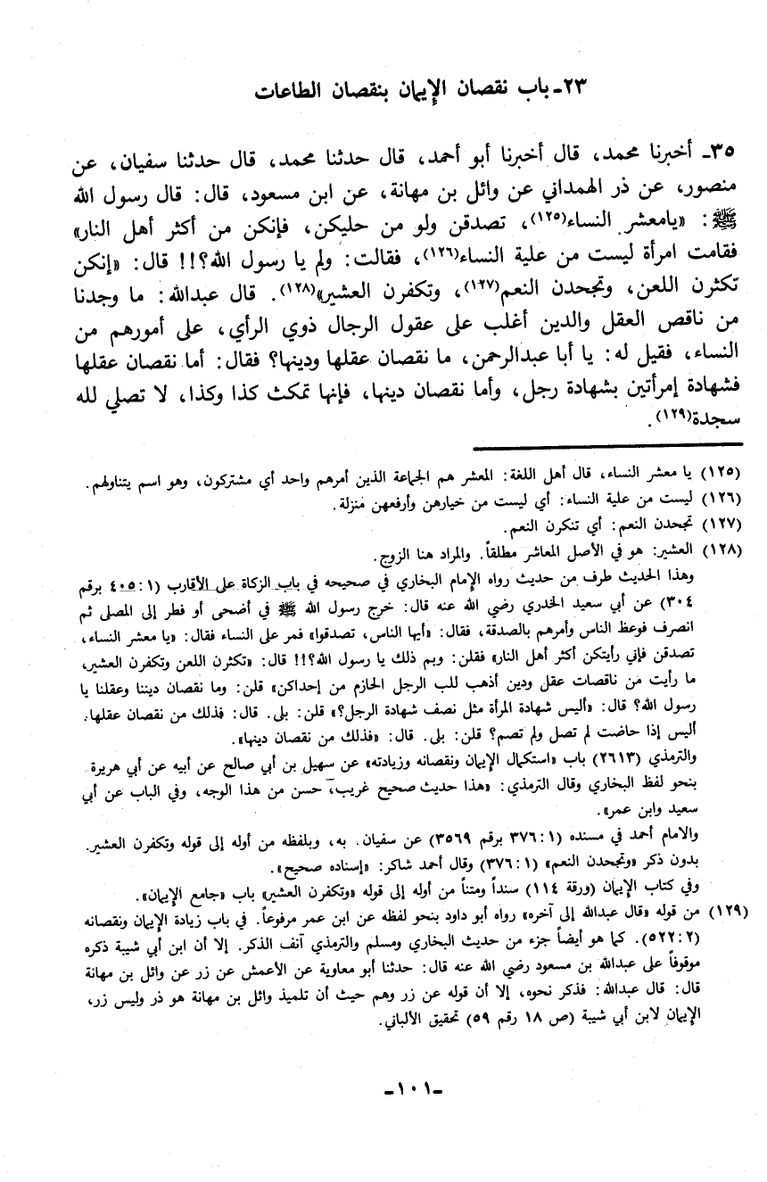 35 - حَدَّثَنَا سُفْيَانُ، عَنْ مَنْصُورٍ، عَنْ ذَرٍّ الْهَمْدَانِيِّ، عَنْ وَائِلِ بْنِ مَهَانَةَ، عَنِ ابْنِ مَسْعُودٍ، قَالَ: قَالَ رَسُولُ اللَّهِ صَلَّى اللهُ عَلَيْهِ وَسَلَّمَ: «§يَا مَعْشَرَ النِّسَاءِ، تَصَدَّقْنَ وَلَوْ مِنْ حُلِيِّكُنَّ، فَإِنَّكُنْ مِنْ أَكْثَرِ أَهْلِ النَّارِ» فَقَامَتِ امْرَأَةٌ لَيْسَتْ مِنْ عِلْيَةِ النِّسَاءِ، فقَالَتْ: وَلِمَ يَا رَسُولَ اللَّهِ؟ قَالَ: «إِنَّكُنَّ تُكْثِرْنَ اللَّعْنَ، وتَجْحُدْنَ النِّعَمَ، وَتَكْفُرْنَ الْعَشِيرَ» قَالَ عَبْدُ اللَّهِ: مَا وَجَدْنَا مِنْ نَاقِصِ الْعَقْلِ وَالدِّينِ أَغْلَبَ عَلَى عُقُولِ الرِّجَالِ ذَوِي الرَّأْيِ عَلَى أُمُورِهِمْ مِنَ النِّسَاءِ، فَقِيلَ لَهُ: يَا أَبَا عَبْدِ الرَّحْمَنِ، مَا نُقْصَانُ عَقْلِها ودِينِهَا؟ فقَالَ: أَمَّا نُقْصَانُ عَقْلِها فَشَهَادَةُ امْرَأَتَيْنِ بِشَهادَةِ رَجُلٍ، وَأَمَّا نُقْصَانُ دِينِهَا فَإِنَّهَا تَمْكُثُ كَذَا وكَذَا لَا تُصَلِّي لِلَّهِ سَجْدَةً