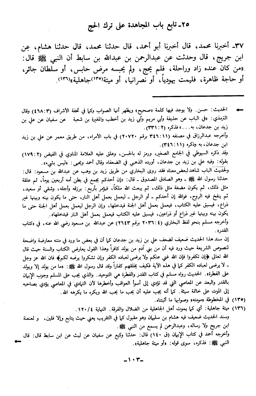 37 - حَدَّثَنَا هِشَامٌ، عَنِ ابْنِ جُرَيْجٍ، قَالَ: وَحُدِّثْتُ عَنْ عَبْدِ الرَّحْمَنِ بْنِ عَبْدِ اللَّهِ بْنِ سَابِطٍ، أَنَّ النَّبِيَّ صَلَّى اللهُ عَلَيْهِ وَسَلَّمَ قَالَ: «§مَنْ كَانَ عِنْدَهُ زَادٌ وَرَاحِلَةٌ، فَلَمْ يَحُجَّ، وَلَمْ يَحْبِسْهُ مَرَضٌ حَابِسٌ، أَوْ سُلْطَانٌ جَائرٌ، أَوْ حاجَةٌ ظَاهِرَةٌ، فَلْيَمُتْ يَهُودِيًّا، أَوْ نَصْرَانِيًّا، أَوْ مَيْتَةً جَاهِلِيَّةً»