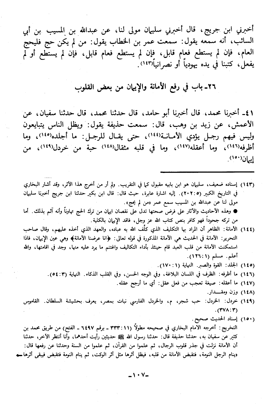 41 - حَدَّثَنَا سُفْيَانُ، عَنِ الْأَعْمَشِ، عَنْ زَيْدِ بْنِ وَهْبٍ، قَالَ: سَمِعْتُ حُذَيْفَةَ، يَقُولُ: «§وَيَظَلُّ النَّاسُ يَتَبَايَعُونَ وَلَيْسَ فِيهِمْ رَجُلٌ يُؤَدِّي الْأَمَانَةَ، حَتَّى يُقَالَ لِلرَّجُلِ مَا أجْلَدَهُ، وَمَا أظْرَفَهُ، وَمَا أعْقَلَهُ، وَمَا فِي قَلْبِهِ مِثْقَالُ حَبَّةٍ مِنْ خَرْدَلٍ مِنْ إِيمَانٍ»