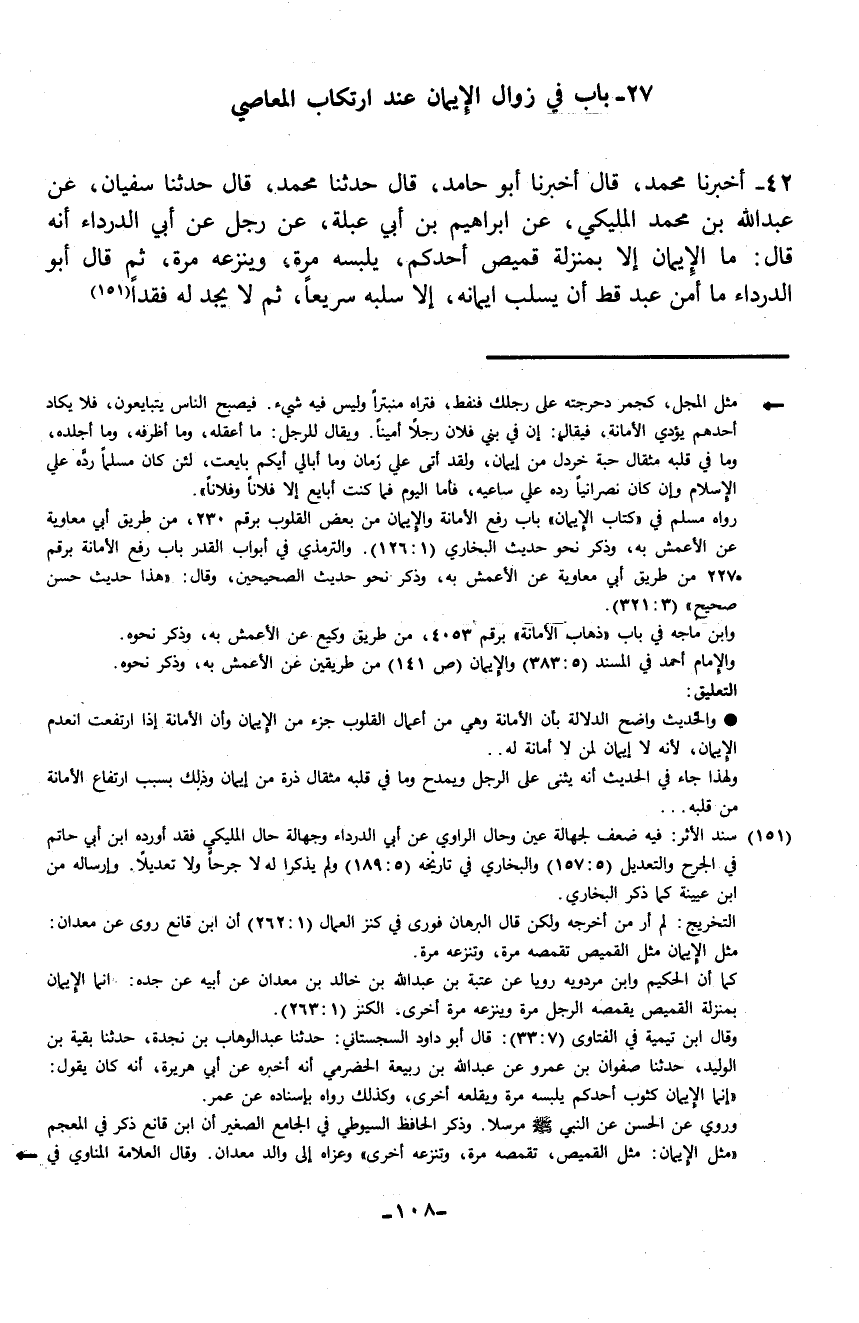 42 - حَدَّثَنَا سُفْيَانُ، عَنْ عَبْدِ اللَّهِ بْنِ مُحَمَّدٍ الْمُلَيْكِيِّ، عَنِ إِبْرَاهِيمَ بْنِ أَبِي عَبْلَةَ، عَنْ رَجُلٍ، عَنْ أَبِي الدَّرْدَاءِ، أَنَّهُ قَالَ: «§مَا الْإِيمَانُ إِلَّا بِمَنْزِلَةِ قَمِيصِ أَحَدِكُمْ، يَلْبَسُهُ مَرَّةً، وَيَنْزِعُهُ مَرَّةً»