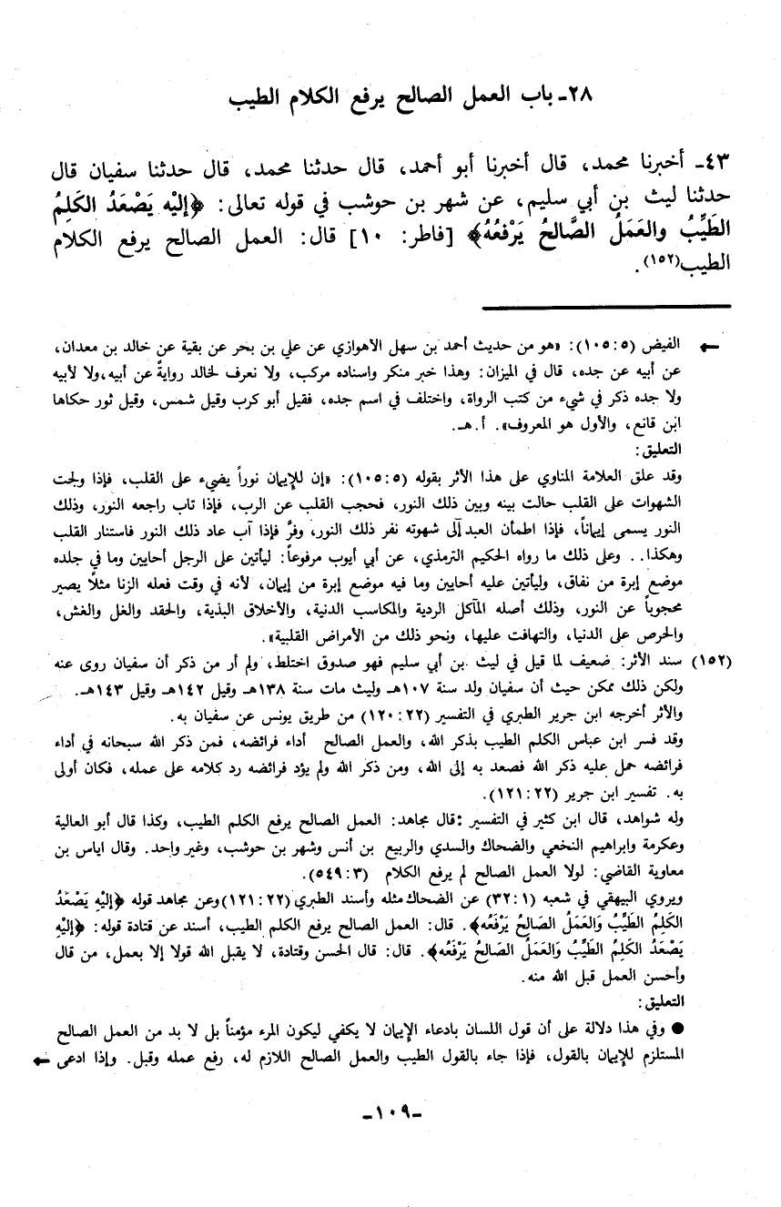 43 - حَدَّثَنَا سُفْيَانُ، قَالَ: حَدَّثَنَا لَيْثُ بْنُ أَبِي سُلَيْمٍ، عَنْ شَهْرِ بْنِ حَوْشَبٍ فِي قَوْلِهِ تَعَالَى {§إِلَيْهِ يَصْعَدُ الْكَلِمُ الطَّيِّبُ وَالْعَمَلُ الصَّالِحُ يَرْفَعُهُ} [فاطر: 10] فَاطِرٌ قَالَ: «الْعَمَلُ الصَّالِحُ يَرْفَعُ الْكَلَامَ الطَّيِّبَ»