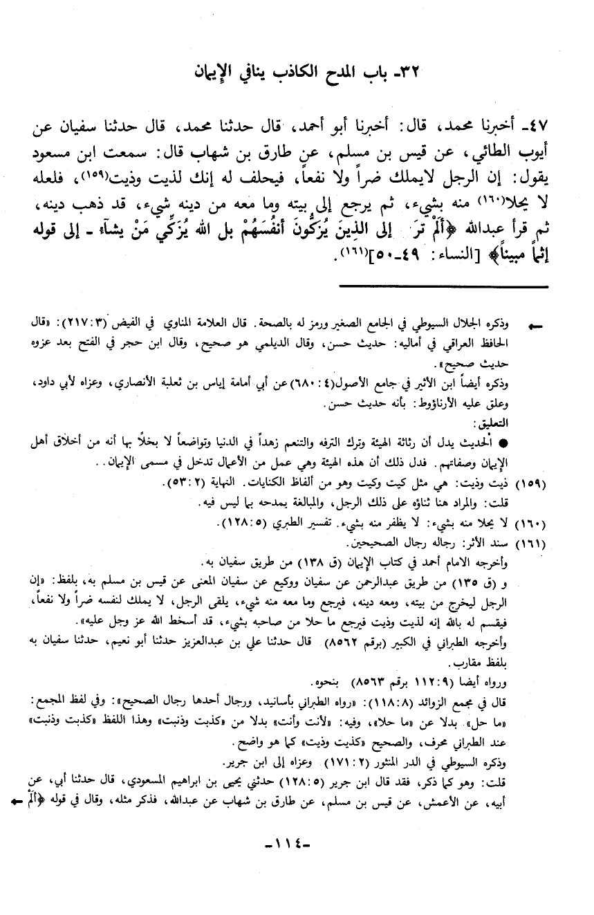 47 - حَدَّثَنَا سُفْيَانُ، عَنْ أَيُّوبَ الطَّائِيِّ، عَنْ قَيْسِ بْنِ مُسْلِمٍ، عَنْ طَارِقِ بْنِ شِهَابٍ، قَالَ: سَمِعْتُ ابْنَ مَسْعُودٍ، يَقُولُ: «إِنَّ §الرَّجُلَ لَا يَمْلِكُ ضَرًّا وَلَا نَفْعًا، فَيُحْلَفُ لَهُ، إِنَّكَ لَذَيْتَ وَذَيْتَ فَلَعَلَّهُ لَا يَحْلَا مِنْهُ بِشَيْءٍ، ثُمَّ يَرْجِعُ إِلَى بَيْتِهِ وَمَا مَعَهُ مِنْ دِينِهِ شَيْءٌ، قَدْ ذَهَبَ دِينُهُ» ، ثُمَّ قَرَأَ عَبْدُ اللَّهِ {أَلَمْ تَرَ إِلَى الَّذِينَ يُزَكُّونَ أَنْفُسَهُمْ بَلِ اللَّهُ يُزَكِّي مَنْ يَشَاءُ} [النساء: 49] إِلَى قَوْلِهِ {إِثْمًا مُبِينًا} [النساء: 50] "