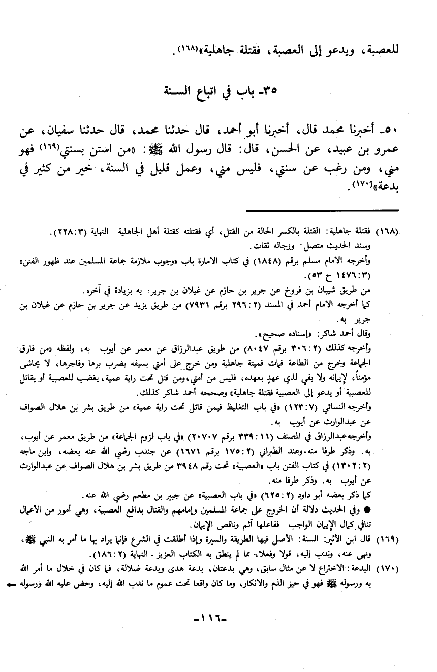 50 - حَدَّثَنَا سُفْيَانُ، عَنْ عَمْرِو بْنِ عُبَيْدٍ، عَنِ الْحَسَنِ، قَالَ: قَالَ رَسُولُ اللَّهِ صَلَّى اللهُ عَلَيْهِ وَسَلَّمَ: «§مَنِ اسْتَنَّ بِسُنَّتِي فَهُوَ مِنِّي، وَمَنْ رَغِبَ عَنْ سُنَّتِي فَلَيْسَ مِنِّي، وَعَمَلٌ قَلِيلٌ فِي السُّنَّةِ، خَيْرٌ مِنْ كَثِيرٍ فِي بِدْعَةٍ»