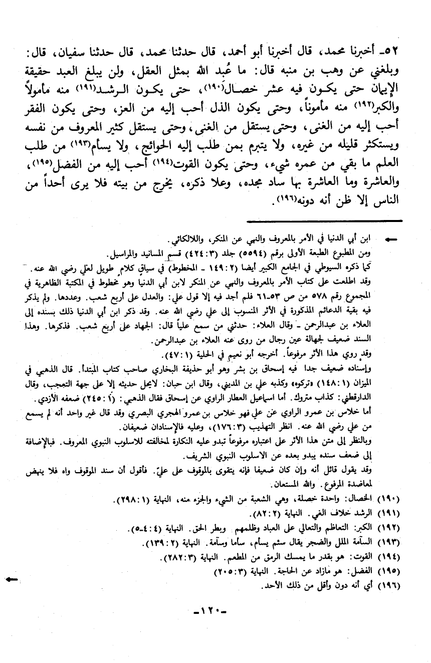 52 - حَدَّثَنَا سُفْيَانُ، قَالَ: وبَلَغَنِي عَنْ وَهْبِ بْنِ مُنَبِّهٍ، قَالَ: " §مَا عُبِدَ اللَّهُ بِمِثْلِ الْعَقْلِ، وَلَنْ يَبْلُغَ الْعَبْدُ حَقِيقَةَ الْإِيمَانِ حَتَّى يَكُونَ فِيهِ عَشْرُ خِصَالٍ: حَتَّى يَكُونَ الرُّشْدُ مِنْهُ مَأْمُولًا، وَالْكِبْرُ مِنْهُ مَأْمُونًا، وَحَتَّى يَكُونَ الذُّلُّ أَحَبَّ إِلَيْهِ مِنَ الْعِزِّ، وحَتَّى يَكُونَ الْفَقْرُ أَحَبَّ إلَيْهِ مِنَ الْغِنَى، وحَتَّى يَسْتَقِلَّ مِنَ الْغِنَى، وَحَتَّى يَسْتَقِلَّ كَثِيرَ الْمَعْرُوفِ مِنْ نَفْسِهِ، ويْسِتَكْثِرَ قَلِيلَهُ مِنْ غَيْرِهِ، وَلَا يَتَبَرَّمَ بِمَنْ طَلَبَ إِلَيْهِ الْحَوَائِجَ، وَلَا يَسْأَمَ مِنْ طَلَبِ الْعِلْمِ مَا بَقِيَ مِنْ عُمُرِهِ شَيْءٌ، وَحَتَّى يَكُونَ الْقُوتُ أَحَبَّ إِلَيْهِ مِنَ الْفَضْلِ، وَالْعَاشِرَةُ وَمَا الْعَاشِرَةُ بِهَا سَادَ مَجْدُهُ، وَعَلَا ذِكْرُهُ، يَخْرُجُ مِنْ بَيْتِهِ فَلَا يَرَى أَحَدًا مِنَ النَّاسِ إِلَّا ظَنَّ أَنَّهُ دُونَهُ "