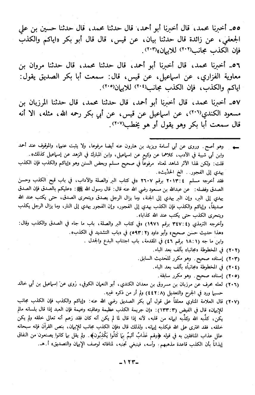 55 - حَدَّثَنَا حُسَيْنُ بْنُ عَلِيٍّ الْجُعْفِيُّ، عَنْ زَائِدَةَ، قَالَ: حَدَّثَنَا بَيَانٌ، عَنْ قَيْسٍ، قَالَ أَبُو بَكْرٍ: «§إِيَّاكُمْ وَالْكَذِبَ، فَإِنَّ الْكَذِبَ مُجَانِبٌ لِلْإِيمَانِ»