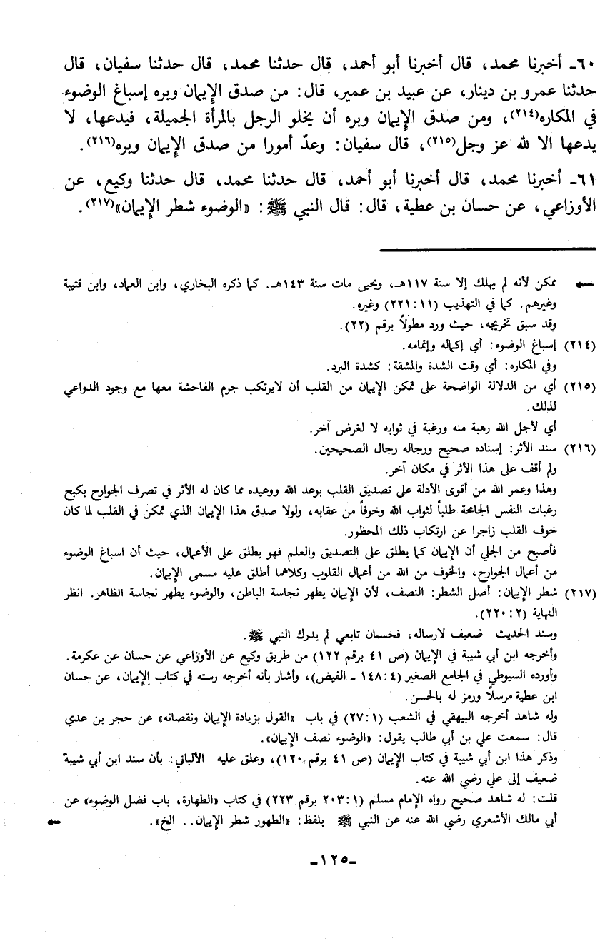 61 - حَدَّثَنَا وَكِيعٌ، عَنِ الْأَوْزَاعِيِّ، عَنْ حَسَّانِ بْنِ عَطِيَّةَ، قَالَ: قَالَ النَّبِيُّ صَلَّى اللهُ عَلَيْهِ وَسَلَّمَ «§وَالْوُضُوءُ شَطْرُ الْإِيمَانِ»