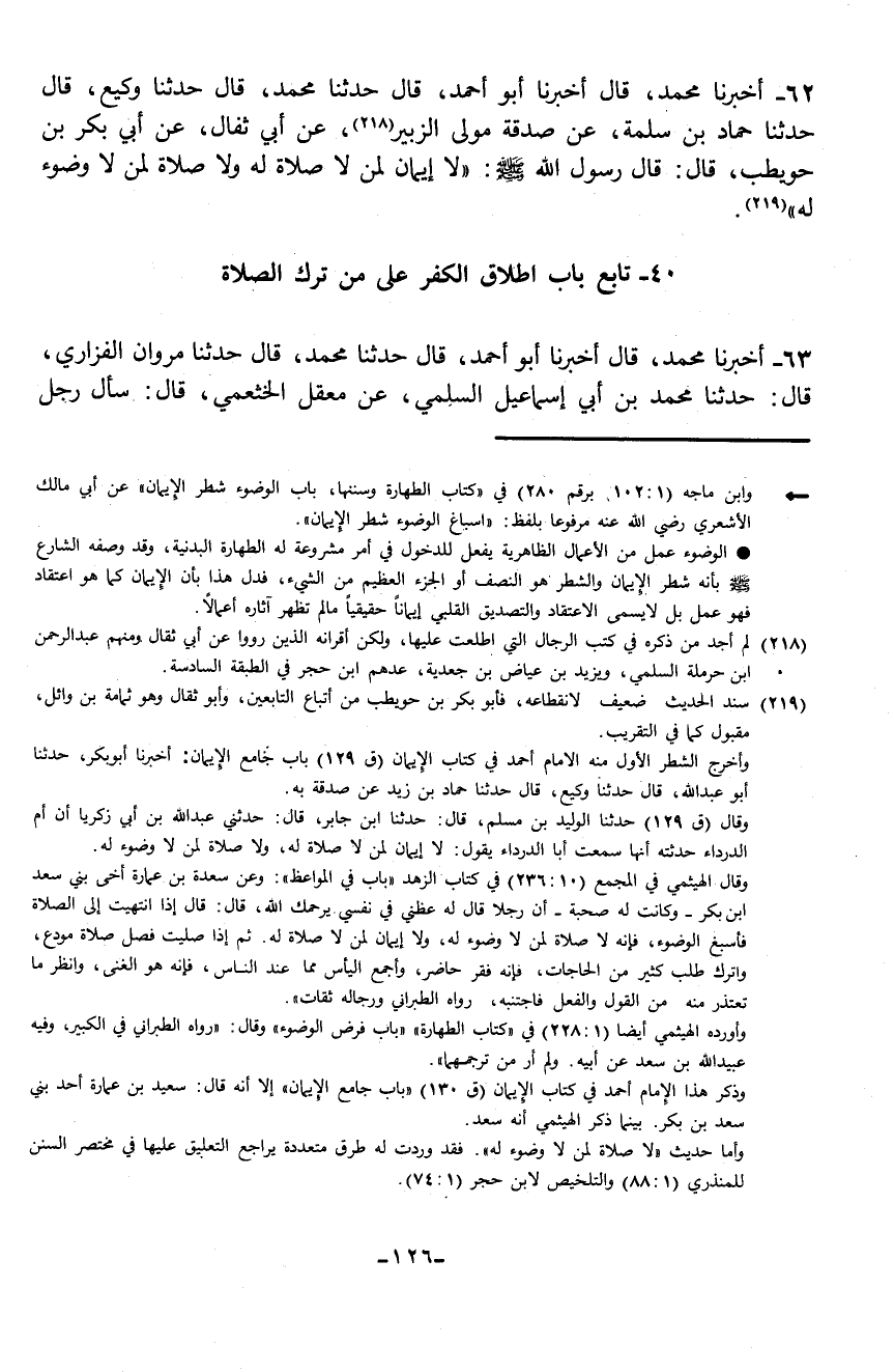 62 - حَدَّثَنَا وَكِيعٌ، قَالَ: حَدَّثَنَا حَمَّادُ بْنُ سَلَمَةَ، عَنْ صَدَقَةَ مَوْلَى الزُّبَيْرِ، عَنْ أَبِي ثِفالٍ، عَنْ أَبِي بَكْرِ بْنِ حُوَيْطِبٍ، قَالَ: قَالَ رَسُولُ اللَّهِ صَلَّى اللهُ عَلَيْهِ وَسَلَّمَ: «§لَا إِيمَانَ لِمَنْ لَا صَلَاةَ لَهُ، وَلَا صَلَاةَ لِمَنْ لَا وُضُوءَ لَهُ»