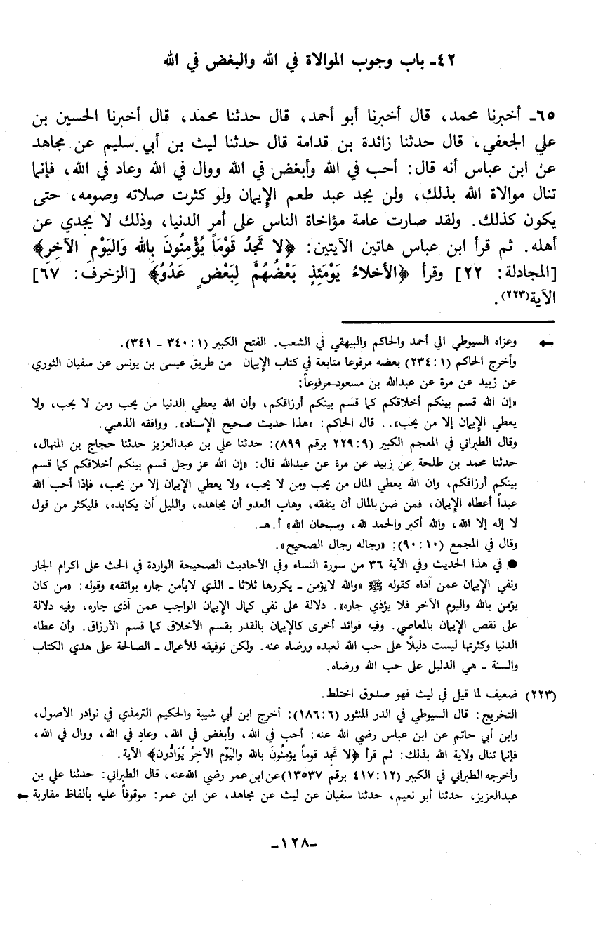 أَخْبَرَنَا الْحُسَيْنُ بْنُ عَلِيٍّ الْجُعْفِيُّ، قَالَ: حَدَّثَنَا زَائِدَةُ بْنُ قُدَامَةَ، قَالَ: حَدَّثَنَا لَيْثُ بْنُ أَبِي سُلَيْمٍ، عَنْ مُجَاهِدٍ، عَنِ ابْنِ عَبَّاسٍ، أَنَّهُ قَالَ: «§أَحِبَّ فِي اللَّهِ، وَأَبْغِضْ فِي اللَّهِ، وَوَالِ فِي اللَّهِ، وَعَادِ فِي اللَّهِ، فَإِنَّمَا تُنَالُ مُوالَاةُ اللَّهِ بذَلِكَ، وَلَنْ يَجِدَ عَبْدٌ طَعْمَ الْإِيمَانِ وَلَوْ كَثُرَتْ صَلَاتُهُ وَصَوْمُهُ حَتَّى يَكُونَ كَذَلِكَ، ولَقَدْ صَارَتْ عَامَّةُ مُؤَاخَاةِ النَّاسِ عَلَى أَمْرِ الدُّنْيَا، وذَلِكَ لَا يُجْدِي عَنْ أَهْلِهِ» . ثُمَّ قَرَأَ ابْنُ عَبَّاسٍ هاتَيْنِ الآيَتَيْنِ: {لَا تَجِدُ قَوْمًا يُؤْمِنُونَ بِاللَّهِ وَالْيَوْمِ الْآخِرِ} [المجادلة: 22] الْمُجَادَلَةُ وَقَرَأَ {الْأَخِلَّاءُ يَوْمَئِذٍ بَعْضُهُمْ لِبَعْضٍ عَدُوٌّ} [الزخرف: 67] الزُّخْرُفُ الْآيَةَ
