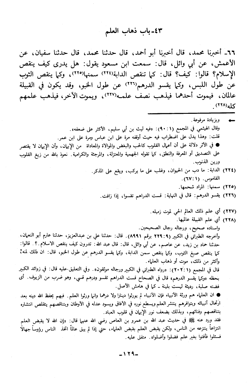 66 - حَدَّثَنَا سُفْيَانُ، عَنِ الْأَعْمَشِ، عَنْ أَبِي وَائِلٍ، قَالَ: سَمِعْتُ ابْنَ مَسْعُودٍ، يَقُولُ: «§هَلْ يُدْرَى كَيْفَ يَنْقُصُ الْإِسْلَامُ؟» قَالُوا: كَيْفَ؟ قَالَ: «كَمَا تُنْقِصُ الدَّابَّةَ سَمْنَهَا، وَكَمَا يَنْقُصُ الثَّوْبُ عَنْ طُولِ اللُّبْسِ، وَكَمَا يَقْسُو الدِّرْهَمُ عَنْ طُولِ الْخَبْوِ، وَقَدْ يَكُونُ فِي الْقَبِيلَةِ عالِمَانِ، فيَمُوتُ أحَدُهُمَا فَيَذْهَبُ نِصْفُ عِلْمِهِ، ويَمُوتُ الْآخَرُ فَيَذْهَبُ عِلْمُهُمْ كُلُّهُ»