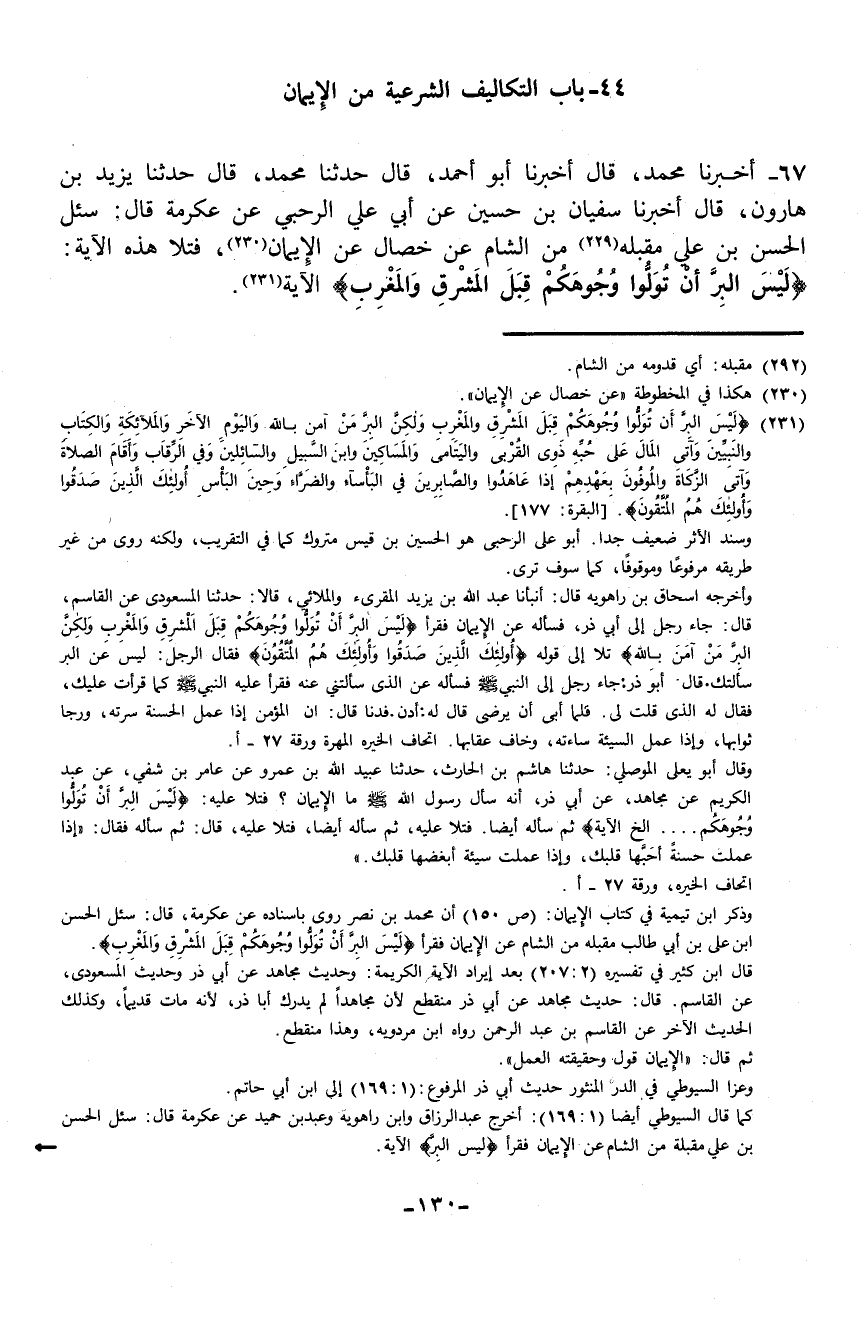 67 - حَدَّثَنَا يَزِيدُ بْنُ هَارُونَ، قَالَ: أَخْبَرَنَا سُفْيَانُ بْنُ حُسَيْنٍ، عَنْ أَبِي عَلِيٍّ الرَّحَبِيِّ، عَنْ عِكْرِمَةَ، قَالَ: سُئِلَ الْحَسَنُ بْنُ عَلِيٍّ، مَقْبِلَهُ مِنَ الشَّامِ عَنْ §خِصَالٍ عَنِ الْإِيمَانِ، فَتَلَا هَذِهِ الْآيَةَ {لَيْسَ الْبِرَّ أَنْ تُوَلُّوا وُجُوهَكُمْ قِبَلَ الْمَشْرِقِ وَالْمَغْرِبِ} [البقرة: 177] الْآيَةَ