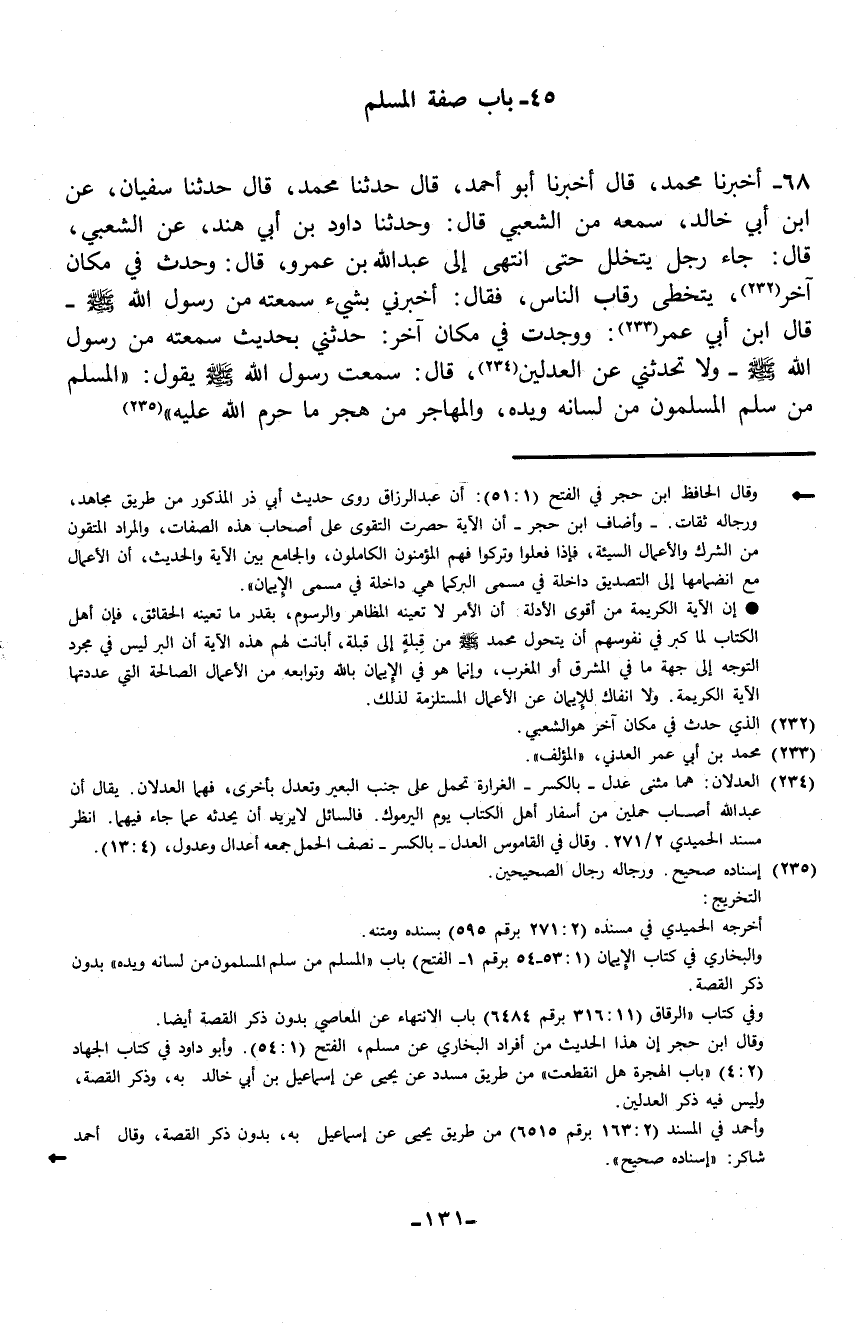 68 - حَدَّثَنَا سُفْيَانُ، عَنِ ابْنِ أَبِي خَالِدٍ، سَمِعَهُ مِنَ الشَّعْبِيِّ، قَالَ: وَحَدَّثَنَا دَاوُدُ بْنُ أَبِي هِنْدٍ، عَنِ الشَّعْبِيِّ، قَالَ: جَاءَ رَجُلٌ يَتَخَلَّلُ حَتَّى انْتَهَى إِلَى عَبْدِ اللَّهِ بْنِ عَمْرٍو، قَالَ: وَحَدَّثَ فِي مكَانٍ آخَرَ يَتَخَطَّى رِقَابَ النَّاسِ فقَالَ: أَخْبِرْنِي بِشَيْءٍ سَمِعْتَهُ مِنْ رَسُولِ اللَّهِ صَلَّى اللهُ عَلَيْهِ وَسَلَّمَ، قَالَ ابْنُ أَبِي عُمَرَ: وَوَجَدْتُ فِي مكَانٍ آخَرَ: حَدِّثْنِي بِحَدِيثٍ سَمِعْتَهُ مِنْ رَسُولِ اللَّهِ صَلَّى اللهُ عَلَيْهِ وَسَلَّمَ، وَلَا تُحَدِّثْنِي عَنِ الْعِدْلَيْنِ، قَالَ: سَمِعْتُ رَسُولَ اللَّهِ صَلَّى اللهُ عَلَيْهِ وَسَلَّمَ يَقُولُ: «§الْمُسْلِمُ مَنْ سَلِمَ الْمُسْلِمُونَ مِنْ لِسَانِهِ وَيَدِهِ، وَالْمُهَاجِرُ مَنْ هَجَرَ مَا حَرَّمَ اللَّهُ عَلَيْهِ»