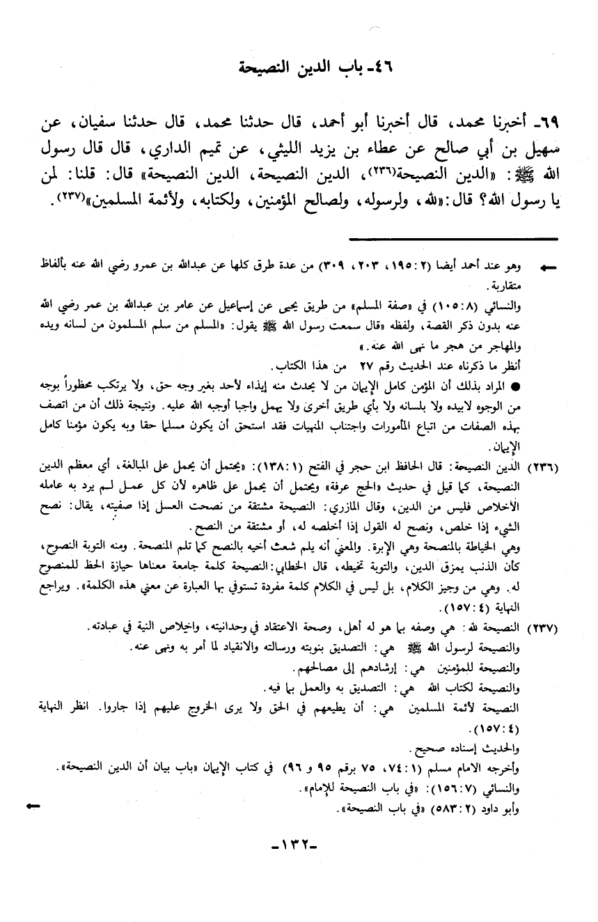 69 - حَدَّثَنَا سُفْيَانُ، عَنْ سُهَيْلِ بْنِ أَبِي صَالِحٍ، عَنْ عَطَاءِ بْنِ يَزِيدَ اللَّيْثِيِّ، عَنْ تَمِيمٍ الدَّارِيِّ، قَالَ: قَالَ رَسُولُ اللَّهِ صَلَّى اللهُ عَلَيْهِ وَسَلَّمَ: «§الدِّينُ النَّصِيحَةُ، الدِّينُ النَّصِيحَةُ، الدِّينُ النَّصِيحَةُ» قَالَ: قُلْنَا: لِمَنْ يَا رَسُولَ اللَّهِ؟ قَالَ: «للَّهِ ولِرَسُولِهِ، ولِصَالِحِ الْمُؤْمِنِينَ، وَلِكِتابِهِ، ولِأَئِمَّةِ الْمُسْلِمِينَ»