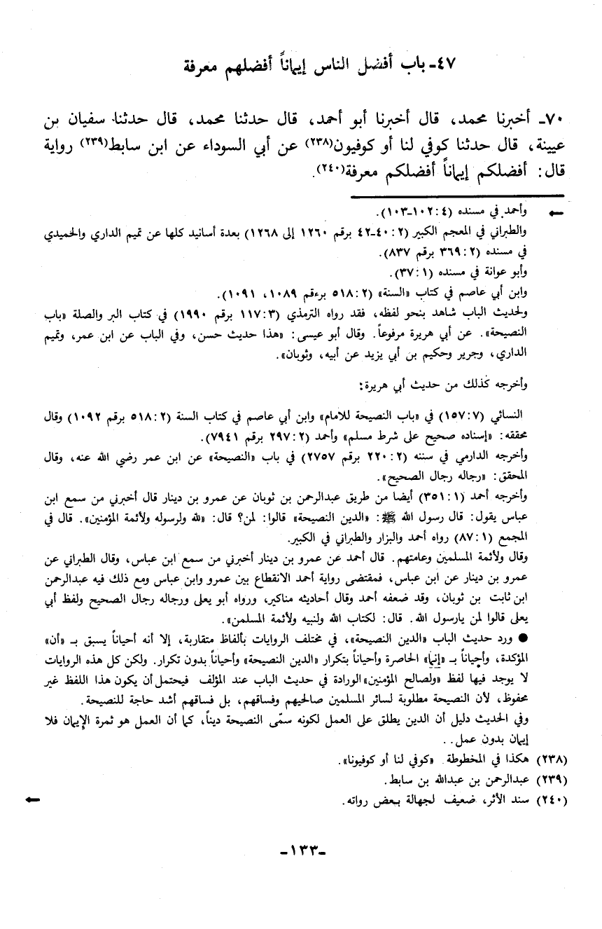 70 - حَدَّثَنَا سُفْيَانُ بْنُ عُيَيْنَةَ، قَالَ: حَدَّثَنَا كُوفِيٌّ لَنَا - أوْ كُوفُيُّونَ -، عَنْ أَبِي السَّوْدَاءِ، عَنِ ابْنِ سَابِطٍ، رِوَايَةً قَالَ: «§أَفْضَلُكُمْ إِيمَانًا أَفْضَلُكُمْ مَعْرِفَةً»