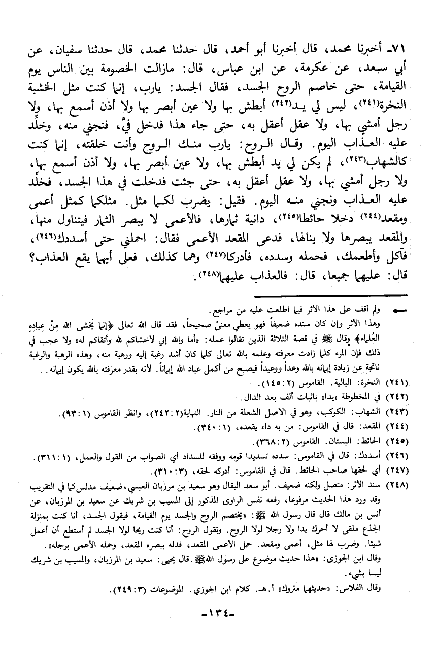 71 - حَدَّثَنَا سُفْيَانُ، عَنْ أَبِي سَعْدٍ، عَنْ عِكْرِمَةَ، عَنِ ابْنِ عَبَّاسٍ، قَالَ: " §مَا زَالَتِ الْخُصُومَةُ بَيْنَ النَّاسِ يَوْمَ الْقِيَامَةِ حَتَّى خَاصَمَ الرُّوحُ الْجَسَدَ، فقَالَ الْجَسَدُ: يَا رَبِّ إِنَّمَا كُنْتُ مِثْلَ الْخَشَبَةِ النَّخِرَةِ، لَيْسَ لِي يَدٌ أَبْطُشُ بِهَا، وَلَا عَيْنٌ أُبْصِرُ بِهَا، وَلَا أُذُنٌ أسْمَعُ بِهَا، وَلَا رِجْلٌ أمْشِي بِهَا، وَلَا عَقْلٌ أَعْقِلُ بِهِ، حَتَّى جَاءَ هَذَا فَدَخَلَ فِيَّ، فَنَجِّنِي مِنْهُ، وخَلِّدْ عَلَيْهِ الْعَذَابَ الْيَوْمَ. وقَالَ الرُّوحُ: يَا رَبِّ مِنْكَ الرُّوحُ وَأَنْتَ خَلَقْتَهُ، إِنَّمَا كُنْتُ كَالشِّهَابِ لَمْ يَكُنْ لِي يَدٌ أَبْطِشُ بِهَا، وَلَا عَيْنٌ أُبْصِرُ بِهَا، وَلَا أُذُنٌ أسْمَعُ بِهَا، وَلَا رِجْلٌ أَمْشِي بِهَا، وَلَا عَقْلٌ أَعْقِلُ بِهِ، حَتَّى جِئْتُ فَدُخِّلْتُ فِي هَذَا الْجَسَدِ، فَخَلِّدْ عَلَيْهِ الْعَذَابَ وَنَجِّنِي مِنْهُ الْيَوْمَ، فَقِيلَ: يُضْرَبُ لَكُمَا مَثَلٌ مَثَلُكُمَا كَمَثَلِ أَعْمَى ومُقْعَدٍ، دَخَلَا حَائِطًا دَانِيَةً ثِمَارُهَا، فَالْأَعْمَى لَا يُبْصِرُ الثِّمَارَ فَيَتَنَاوَلَ مِنْهَا، وَالْمُقْعَدُ يُبْصِرُهَا وَلَا يَنَالُهَا، فَدَعَا الْمُقْعَدُ الْأَعْمَى، فقَالَ: احْمِلْنِي حَتَّى أُسَدِّدَكَ، فَآكُلَ وأُطْعِمَكَ، فَحَمَلَهُ وَسَدَّدَهُ، فَأَدْرَكَا وَهُمَا كَذَلِكَ، فعَلَى أيِّهِمَا يَقَعُ الْعَذَابُ؟ قَالَ: عَلَيْهِمَا جَمِيعًا، قَالَ: فَالْعَذَابُ عَلَيْهِمَا "