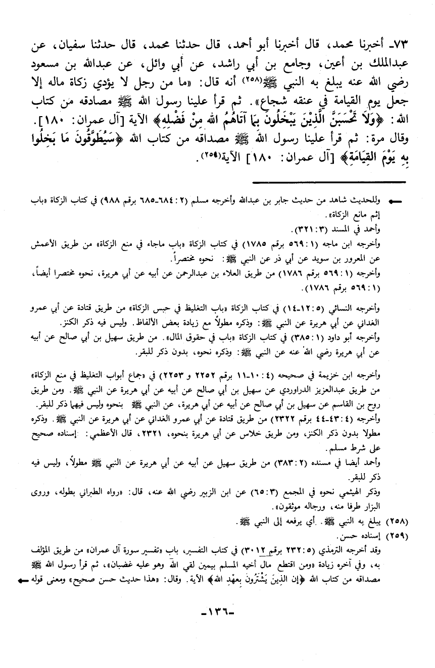 73 - حَدَّثَنَا سُفْيَانُ، عَنْ عَبْدِ الْمَلِكِ بْنِ أعْيَنَ، وجَامِعِ بْنِ أَبِي رَاشِدٍ، عَنْ أَبِي وَائِلٍ، عَنْ عَبْدِ اللَّهِ بْنِ مَسْعُودٍ رَضِيَ اللَّهُ عَنْهُ، يَبْلُغُ بِهِ النَّبِيَّ صَلَّى اللهُ عَلَيْهِ وَسَلَّمَ أَنَّهُ قَالَ: «§مَا مِنْ رَجُلٍ لَا يُؤَدِّي زَكَاةَ مَالِهِ إِلَّا جُعِلَ يَوْمَ الْقِيَامَةِ فِي عُنُقِهِ شُجَاعٌ» ثُمَّ قَرَأَ عَلَيْنَا رَسُولُ اللَّهِ صَلَّى اللهُ عَلَيْهِ وَسَلَّمَ مُصَادِقَهُ مِنْ كِتَابِ اللَّهِ: {وَلَا تَحْسَبَنَّ الَّذِينَ يَبْخَلُونَ بِمَا آتَاهُمُ اللَّهُ مِنْ فَضْلِهِ} الْآيَةَ. وقَالَ مَرَّةً: ثُمَّ قَرَأَ عَلَيْنَا رَسُولُ اللَّهِ صَلَّى اللهُ عَلَيْهِ وَسَلَّمَ مِصْدَاقَهُ مِنْ كِتَابِ اللَّهِ: {سَيُطَوَّقُونَ مَا بَخِلُوا بِهِ يَوْمَ الْقِيَامَةِ} [آل عمران: 180] الْآيَةَ