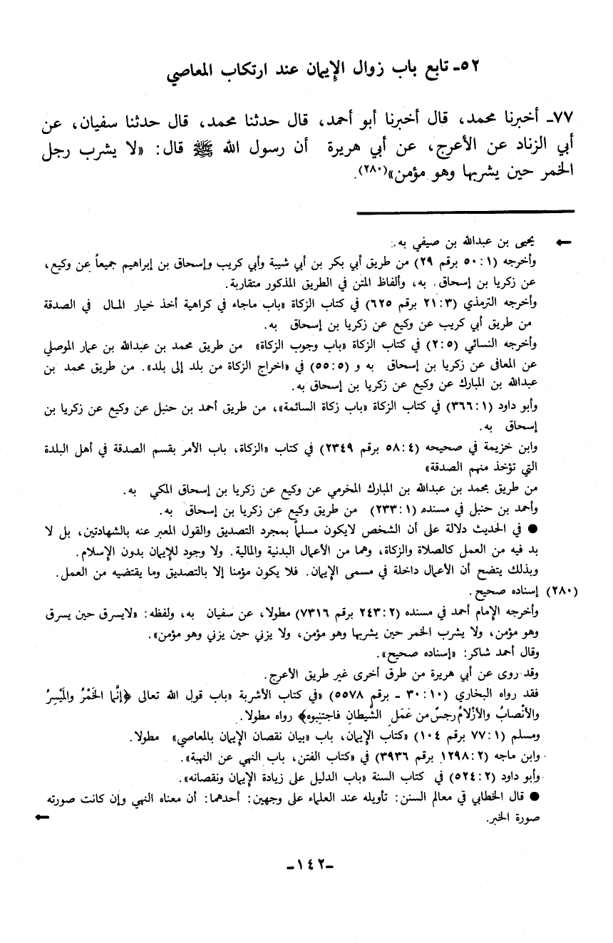77 - حَدَّثَنَا سُفْيَانُ، عَنْ أَبِي الزِّنَادِ، عَنِ الْأَعْرَجِ، عَنْ أَبِي هُرَيْرَةَ، أَنَّ رَسُولَ اللَّهِ صَلَّى اللهُ عَلَيْهِ وَسَلَّمَ قَالَ: «§لَا يَشْرَبُ رَجُلٌ الْخَمْرَ حِينَ يَشْرَبُهَا وَهُوَ مُؤْمِنٌ»